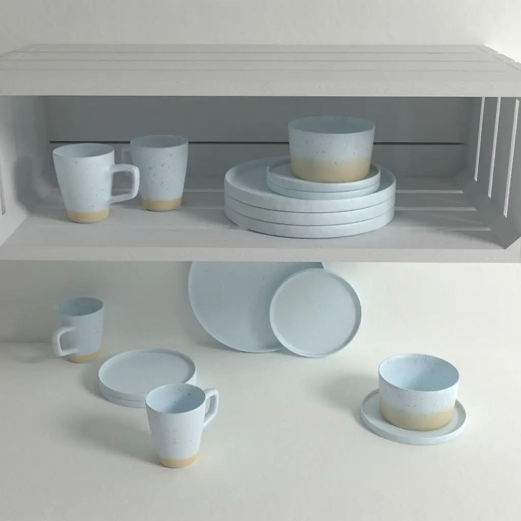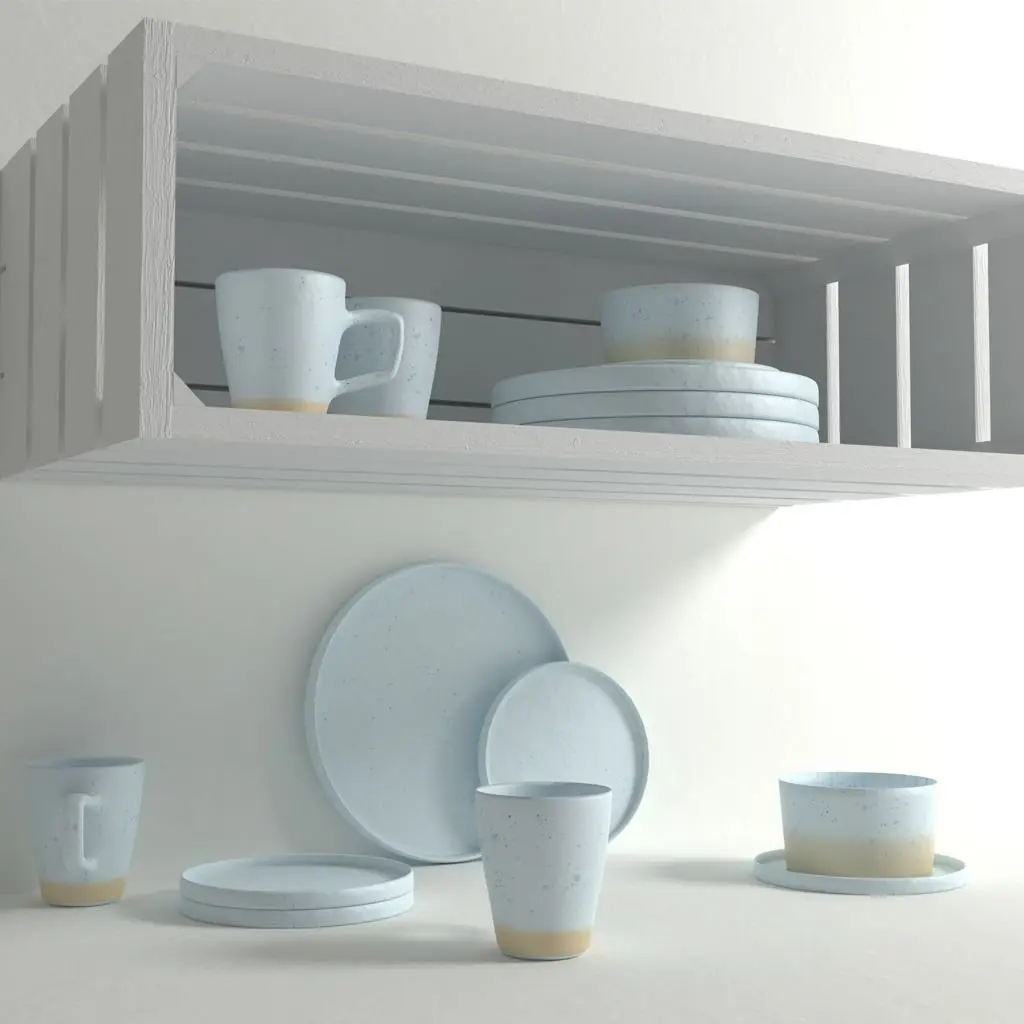 24 objects: round plates in two sizes, bowls and cups + shelf.