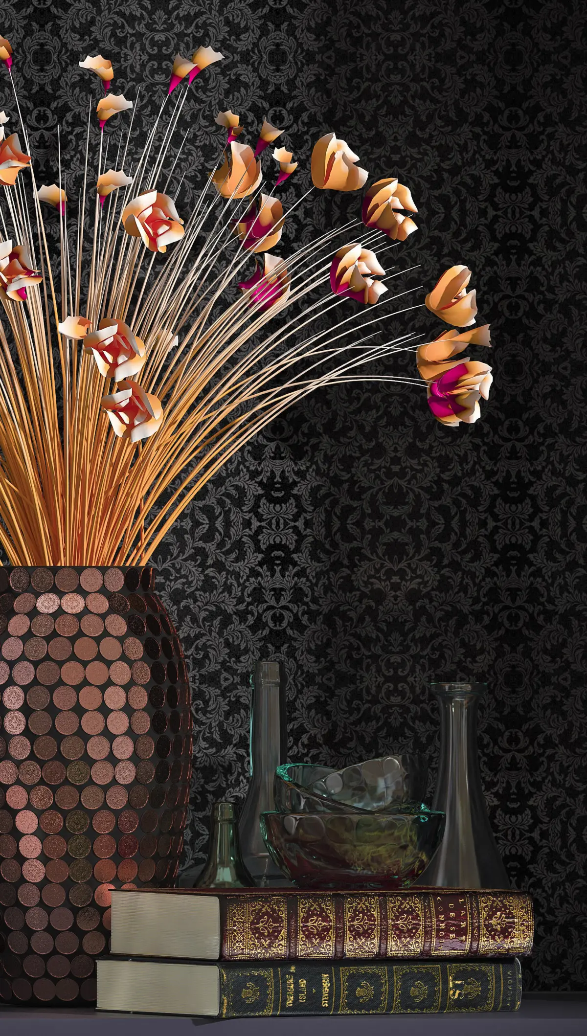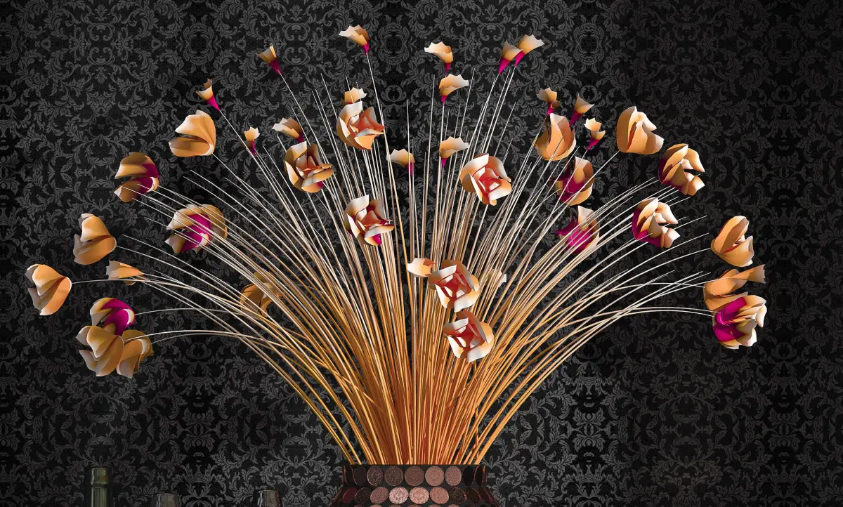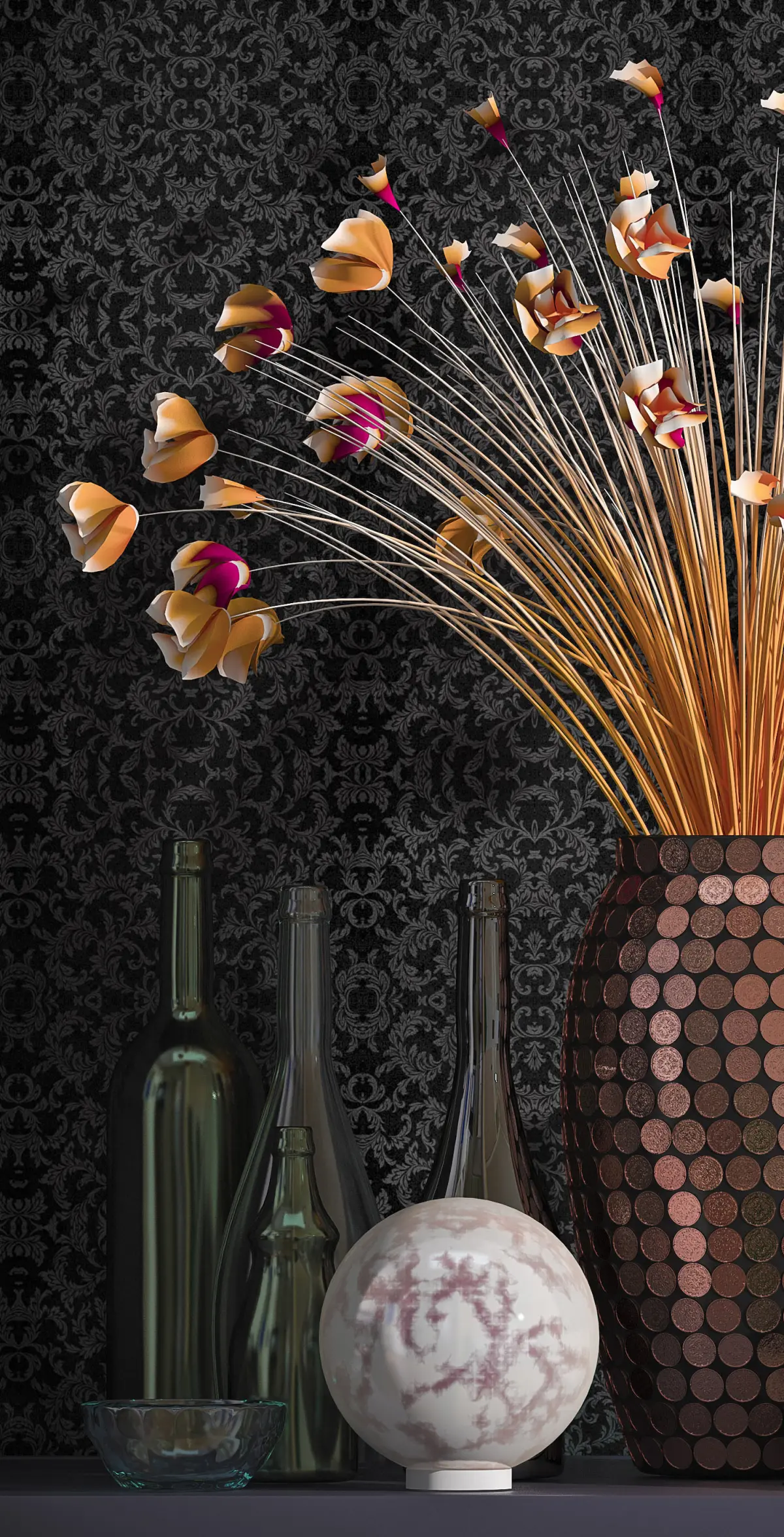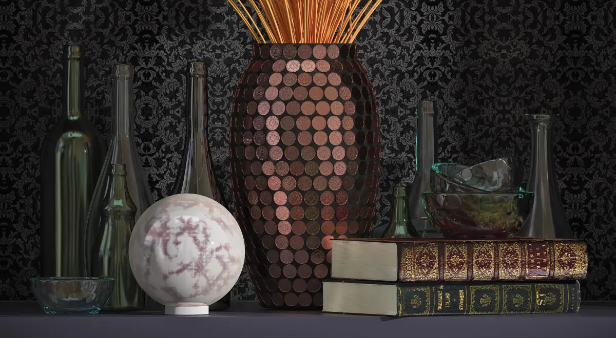 TABLE WARE CONTAINS METALIC VASE WITH A DECIRATIVE FLOWERS ANS GLASSWARE BOTTELS VESSELS AND BOOKS ARE TOGETHERLY MADE IT A COMPLETE TABLEWARE, DESIGNED IN 3DSMAX