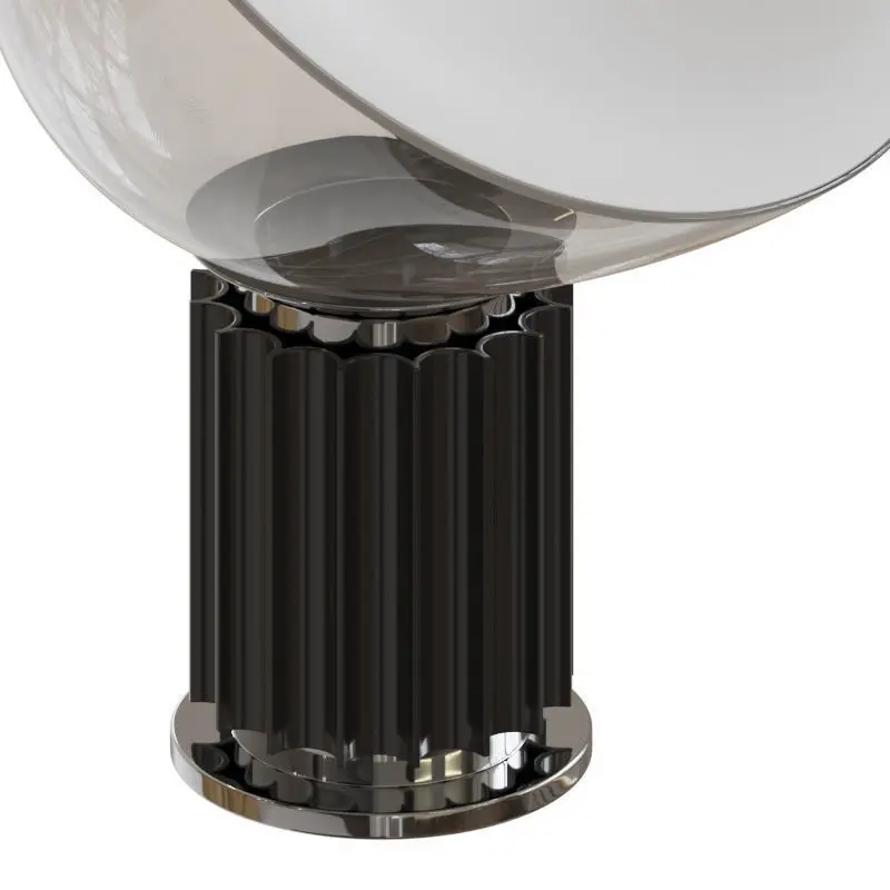 The Castiglioni brother's Taccia Table Lamp is one of Flos' most recognisable designs.This Flos table light is renowned for being a classic of Italian mid-century design. The Taccia Lamp's base features a truncated, fluted column that houses the light fitting. Its upside-down 'dome' reflector creates the illusion that light is generated from the shade rather than its base.The painted aluminium reflector provides both direct and indirect light. It is gloss white on the outside and matt white on the inside and encased in transparent mouth-blown glass. The stem is crafted from matt black bronze or silver anodised aluminium with a nickel-plated base.