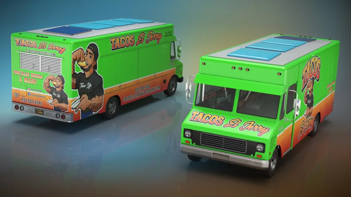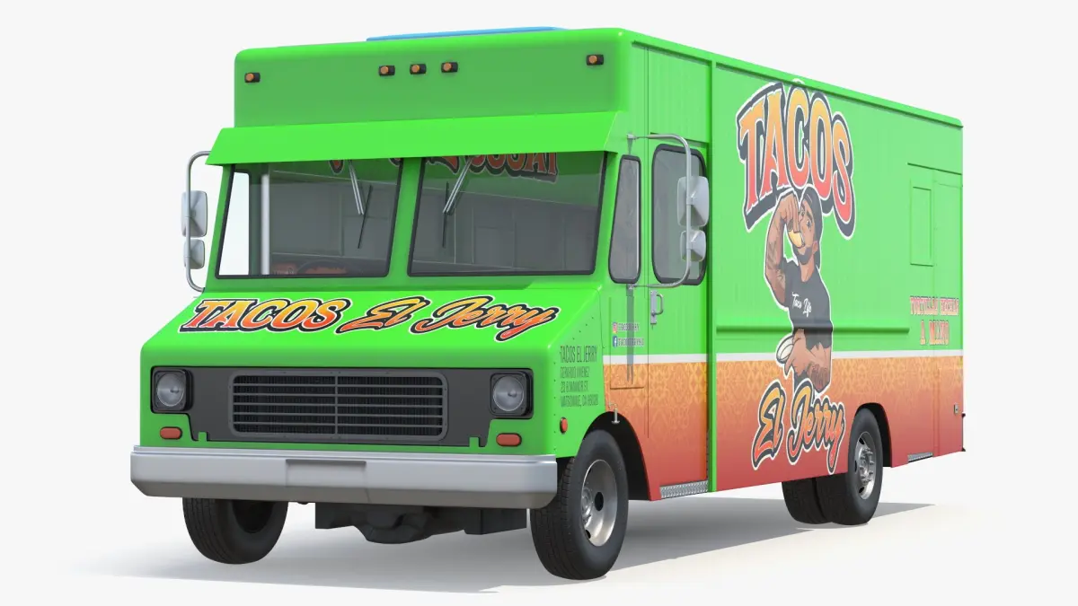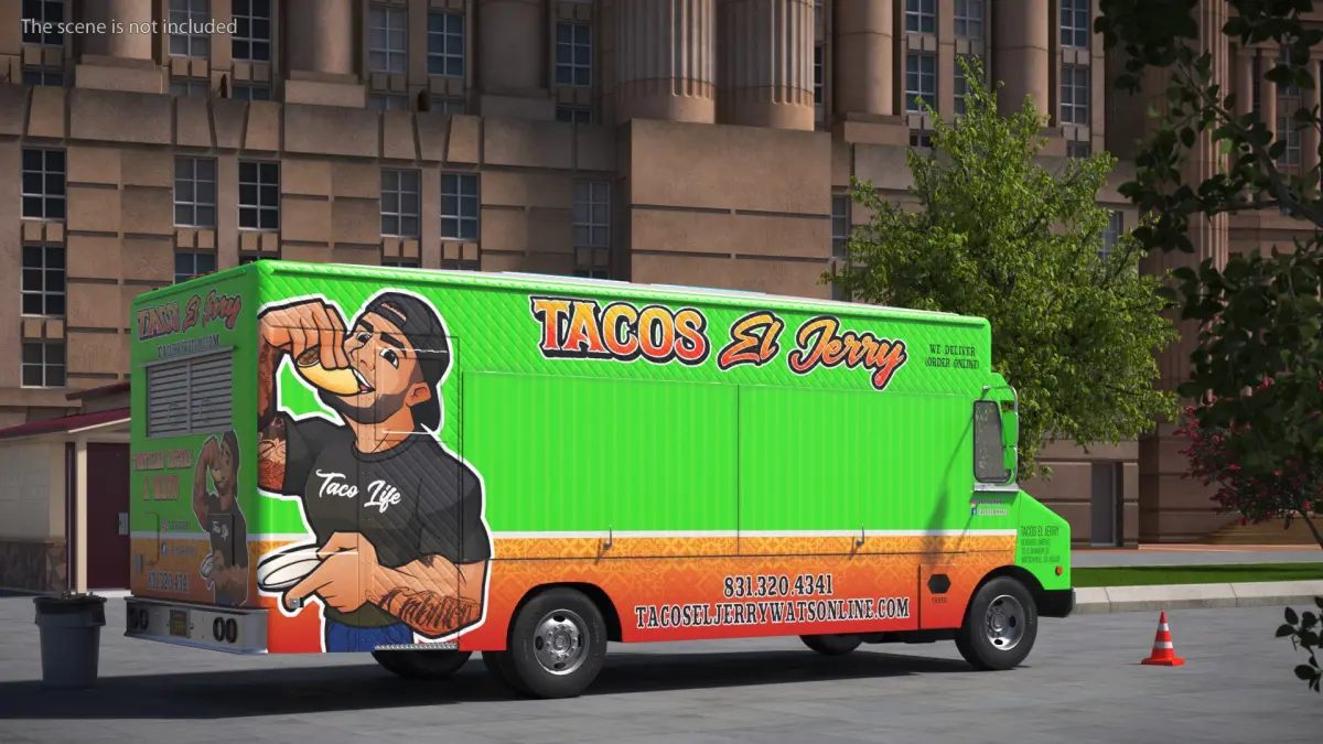 Tacos Street Vendor Truck Simplified is a three-dimensional model of Mexican tacos street food vendor van (light truck), that is equipped with a roof mounted solar-charged energy system.