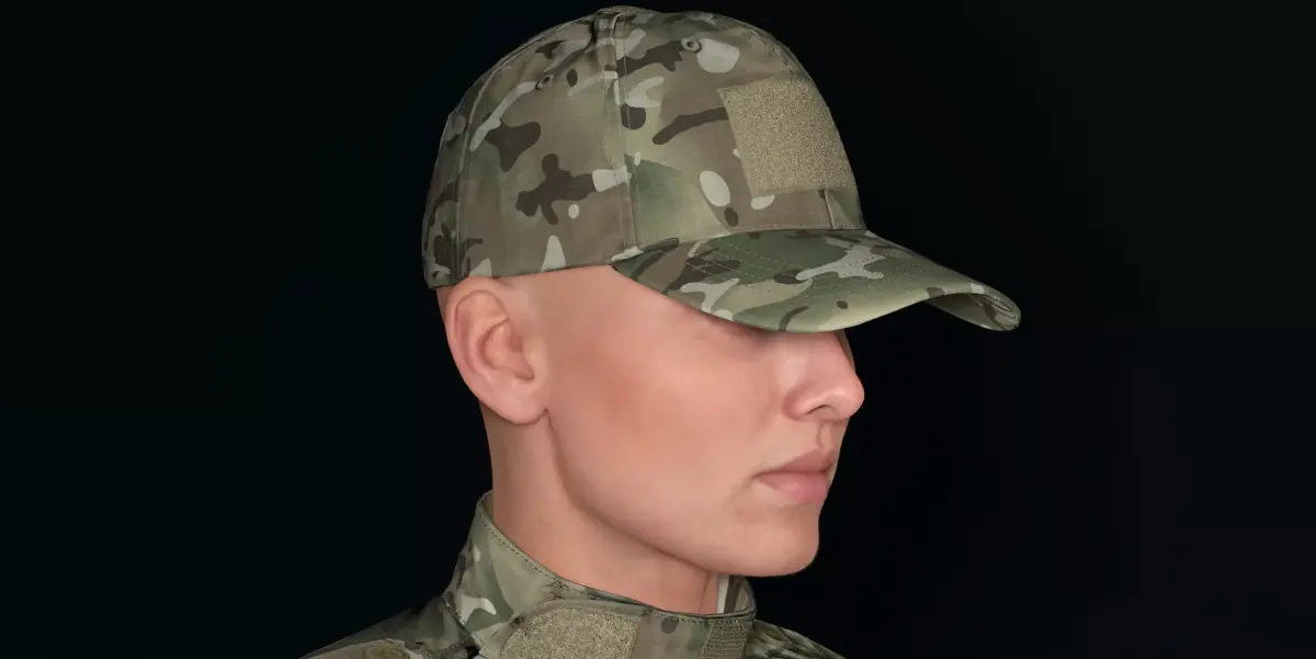 The cap is shown worn with GritForm3D's Tactical Combat Uniform. Part of the growing GF3D ecosystem of game-ready tactical gear.