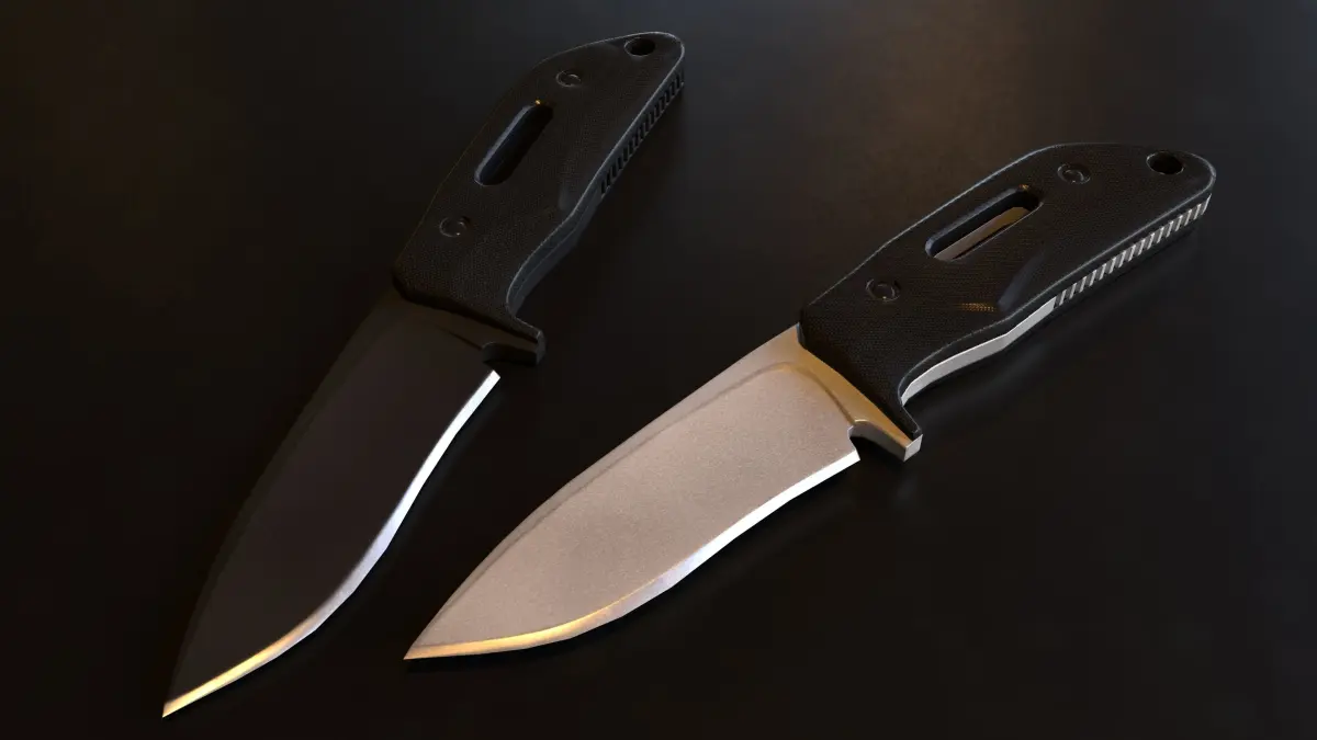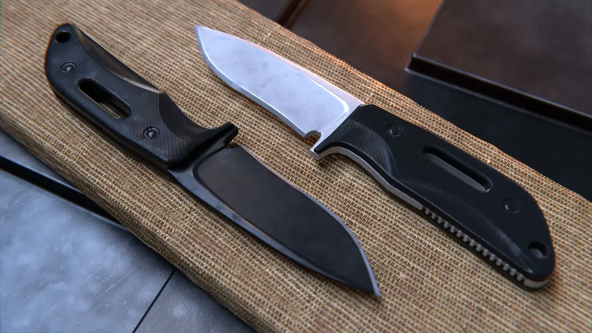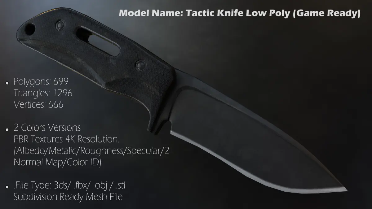 A Very Detailed Low Poly tactical Combat Knife with High-Quality PBR Textures. The blade has a detailed electric process steel, and the handle is covered in a black carbon fiber material.