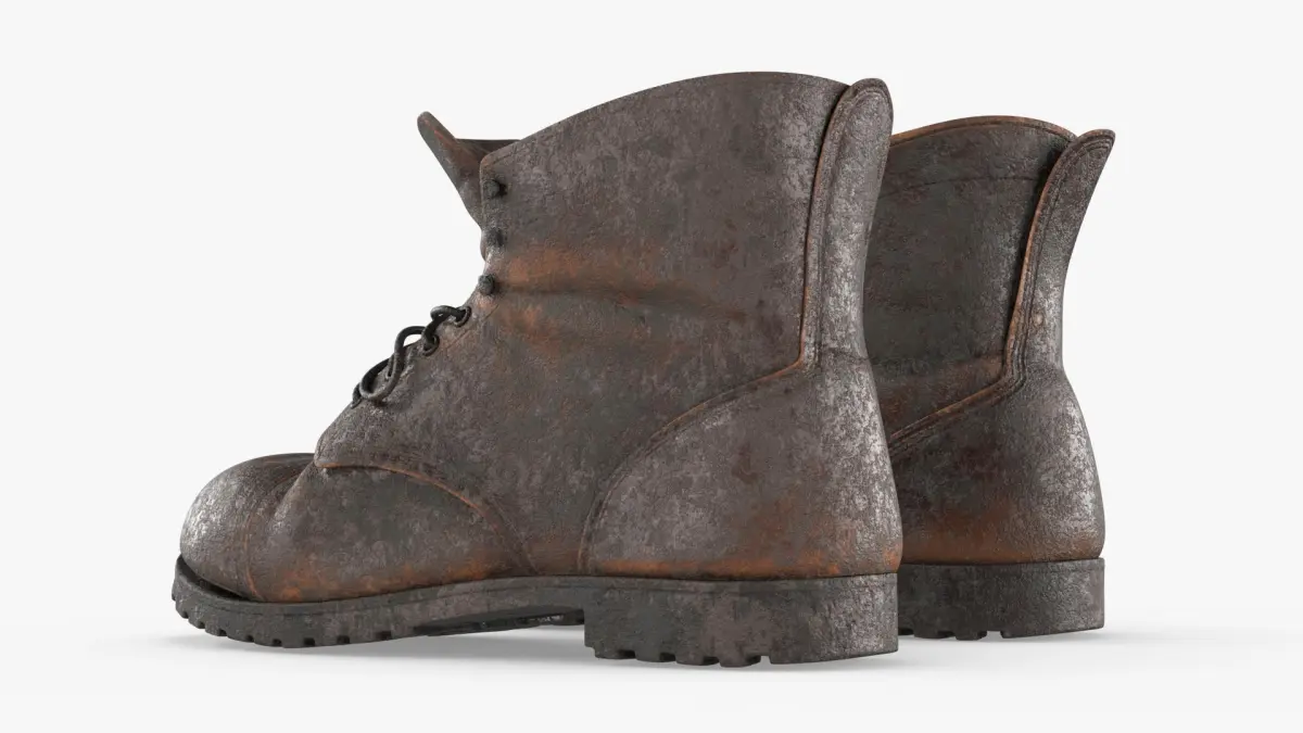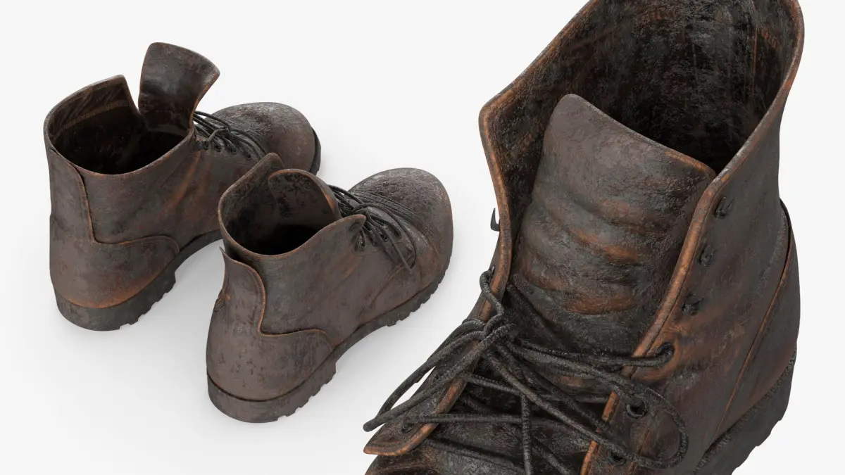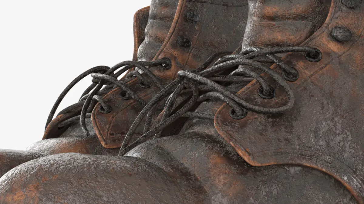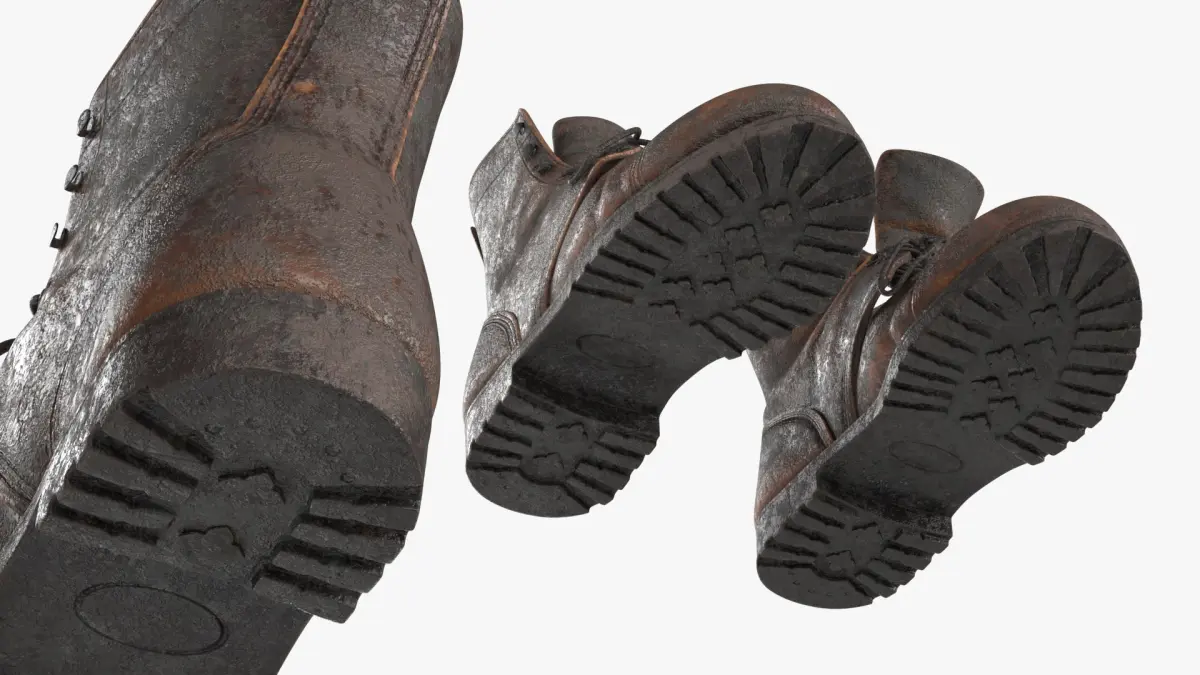 The model features distressed leather textures, creased surfaces, laces, and mud-stained soles, replicating the look of boots that have endured extensive outdoor and field use. Its gritty appearance enhances immersion in historical, tactical, or survival-themed visualizations.