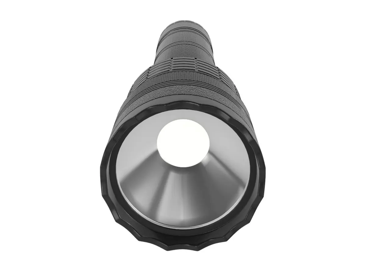 A rugged black tactical flashlight with a textured grip for a secure hold, featuring a bright LED light that can illuminate the darkest of trails in the current timeline.
