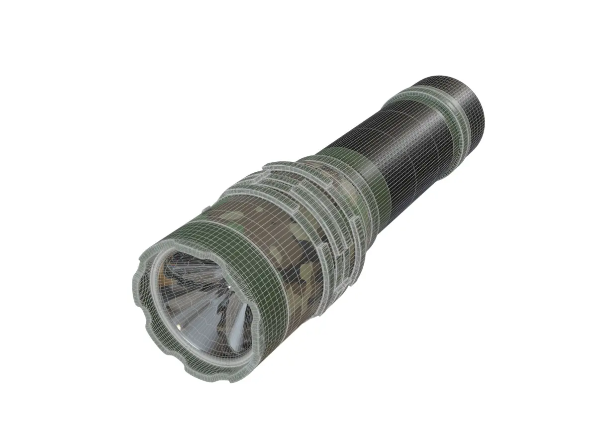 A camouflaged tactical flashlight with a sturdy construction, blending seamlessly with outdoor gear, offering a reliable light source for survivalists or campers in the current timeline.