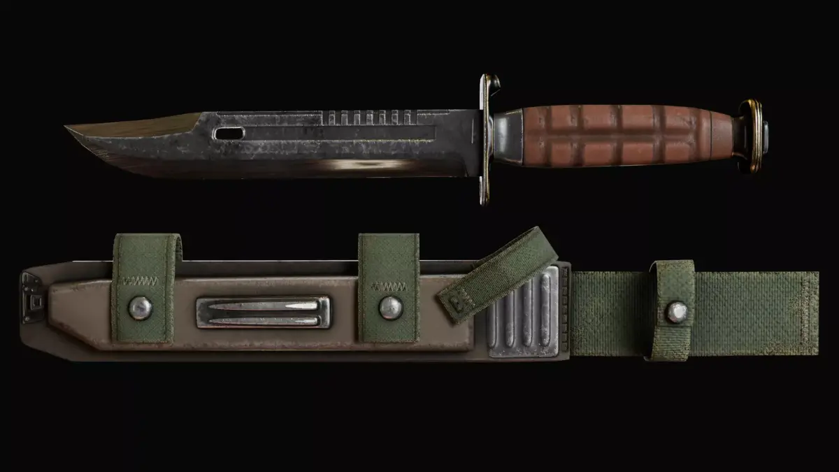 A game ready high quality 3D bundle of essential military equipment, featuring a tactical radio, smoke grenade, water bottle, combat knife, flashlight, and snap hook.this tactical loadout is all in 1 4 k
