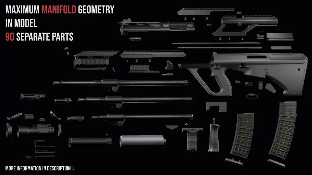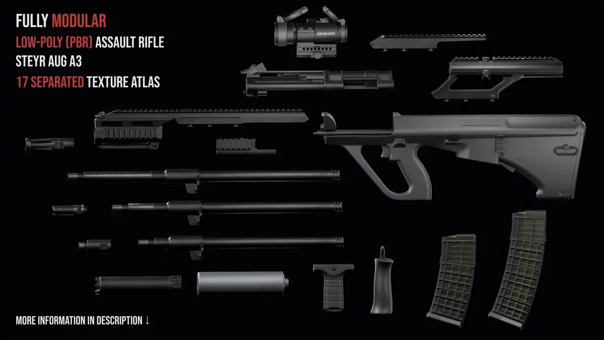 High quality low-poly model tactical AUG A3 , created as close as possible to the original with exact dimensions, with highly detailed PBR textures(including textures for Unity and UE5 game engines).I create my models as realistic as possible. You won't see the magazine shaft , barrel, chamber or bolt , covered by the texture or geometry. If you even need to see the rifling in the barrel or any other small details of the weapon. Then this model is exactly for your project. Maximum manifold geometry in model. Open (non-manifold) geometry is only present in rare cases,but you will never see it even with any weapon animation and other manipulations .** Game ready model for PBR game engines, renderers, first Person Shooters, VR games, and your other projects.**