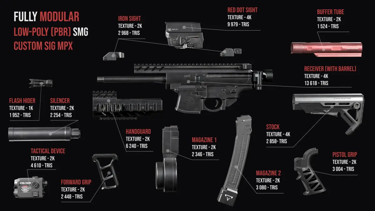 High quality low-poly model SIG MPX , created as close as possible to the original with exact dimensions, with highly detailed PBR textures(including textures for Unity and UE5 game engines). I create my models as realistic as possible. You won't see the magazine shaft , barrel, chamber or bolt , covered by the texture or geometry. If you even need to see the rifling in the barrel or any other small details of the weapon. Then this model is exactly for your project. Maximum manifold geometry in model. Open (non-manifold) geometry is only present in rare cases,but you will never see it even with any weapon animation and other manipulations. Game ready model for PBR game engines, renderers, first Person Shooters, VR games, and your other projects.