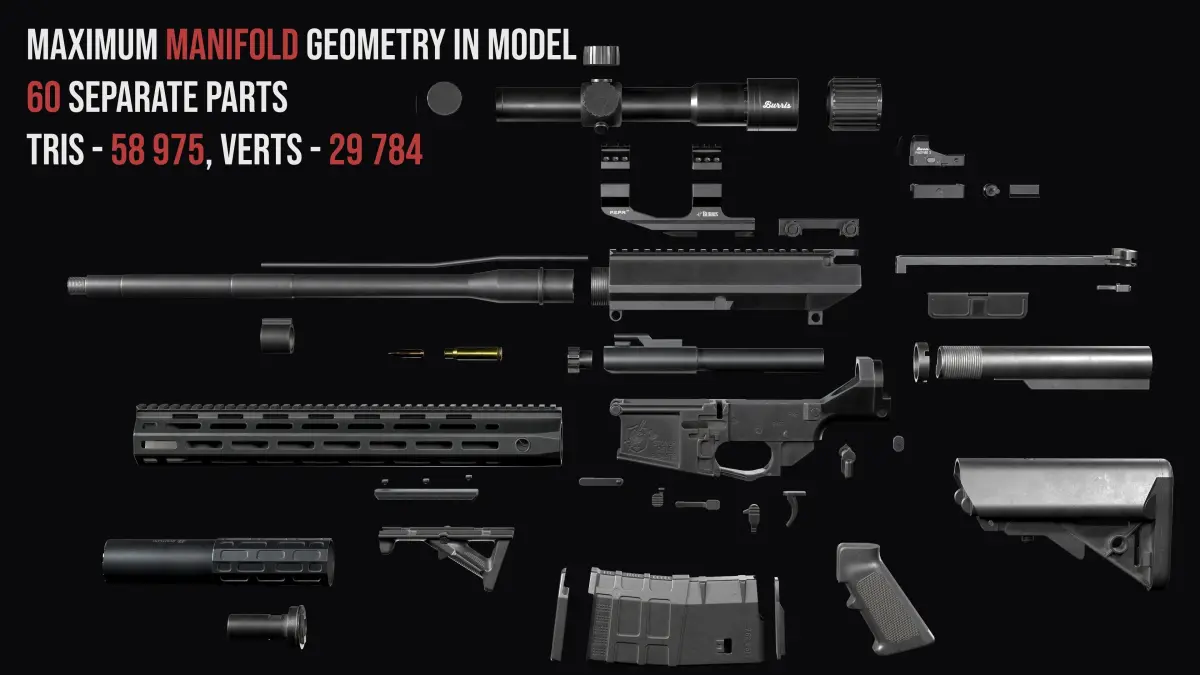 The modularity and uniqueness of this assembly lies in the fact that all minor parts such as the stock, buffer tube, receiver, red dot, silencer, pistol grip, handguard , picatinny rail, riflescope, ammo and magazine have a unique separate texture atlas. You can easily replace one of the parts with another, even leaving only one receiver.