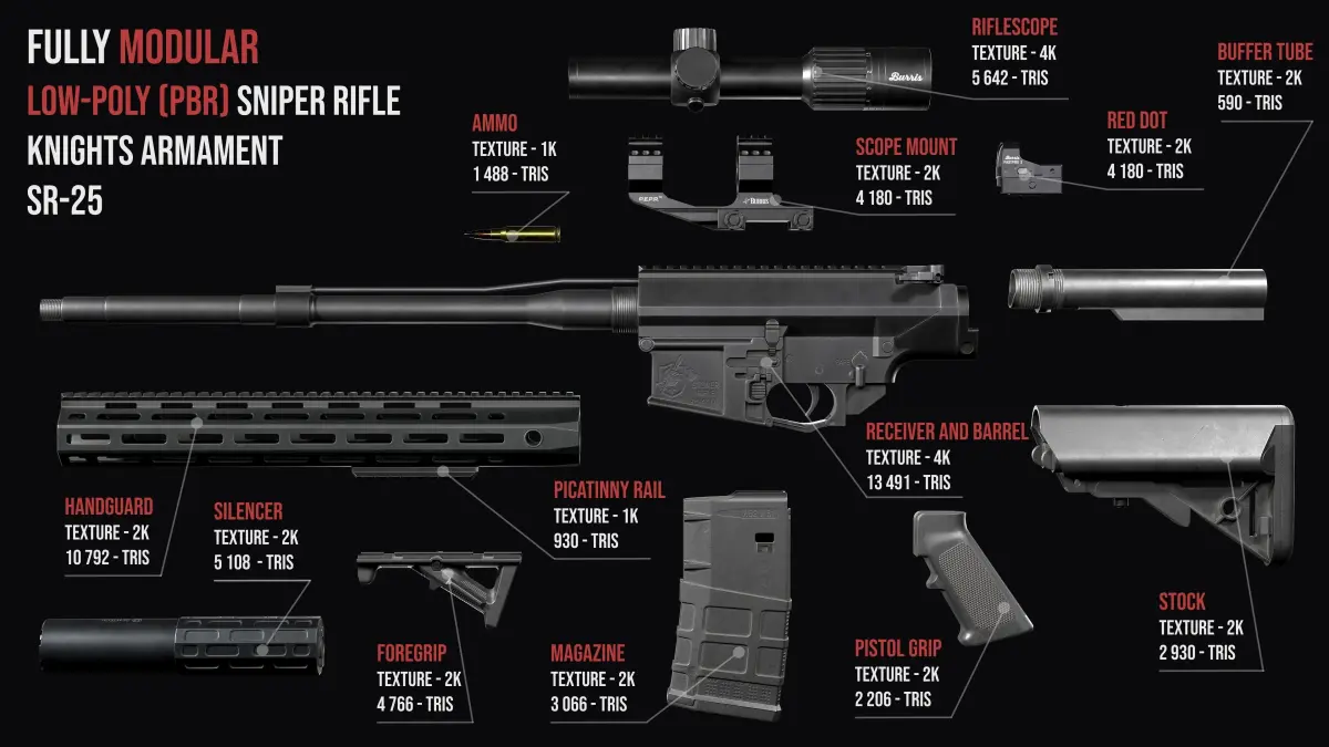 High quality low-poly model tactical SR 25 , created as close as possible to the original with exact dimensions, with highly detailed PBR textures(including textures for Unity and UE5 game engines).I create my models as realistic as possible. You won't see the magazine shaft , barrel, chamber or bolt , covered by the texture or geometry. If you even need to see the rifling in the barrel or any other small details of the weapon. Then this model is exactly for your project. Maximum manifold geometry in model. Open (non-manifold) geometry is only present in rare cases,but you will never see it even with any weapon animation and other manipulations . Game ready model for PBR game engines, renderers, first Person Shooters, VR games, and your other projects.