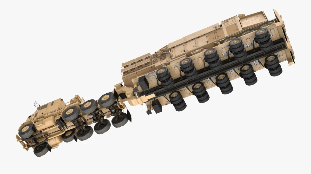 This model showcases a robust, tactical design, featuring multiple axles and a powerful, armored cab. The M1000 trailer is designed for high-load capacity, equipped with numerous wheels for balance and reliability on challenging terrains. The overall structure emphasizes durability and function, making it ideal for transporting tanks and other large military assets.