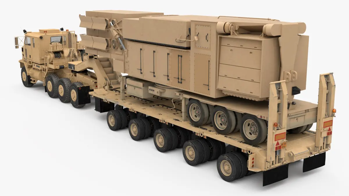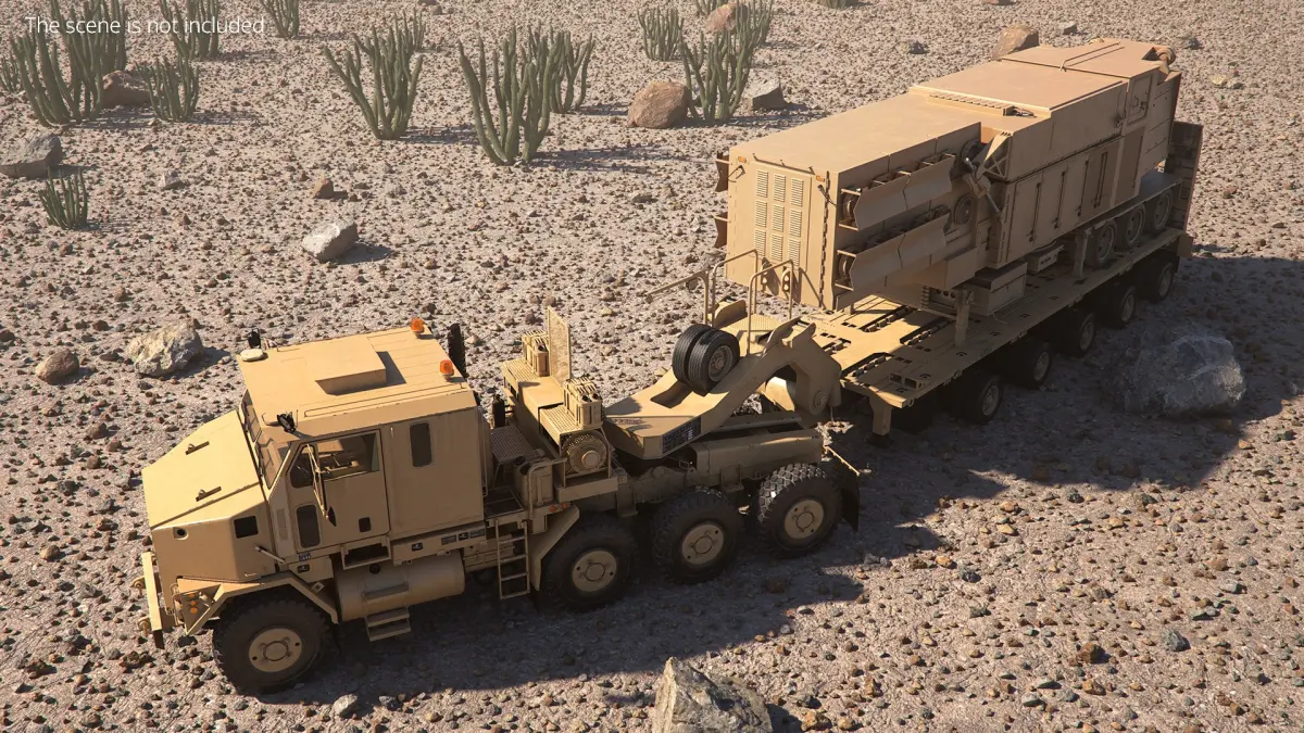Tactical Radar Transport Heavy Hauler Sand is a 3d model of a high-mobility military transport vehicle, crafted to efficiently haul heavy equipment and machinery.