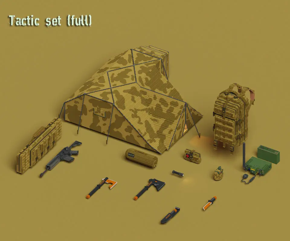 - Camp - is divided into 4 parts (bottom, two halves and ropes) for better voxel optimization. I will try to make this model more convenient over time. Verts: 6596 Faces: 12586