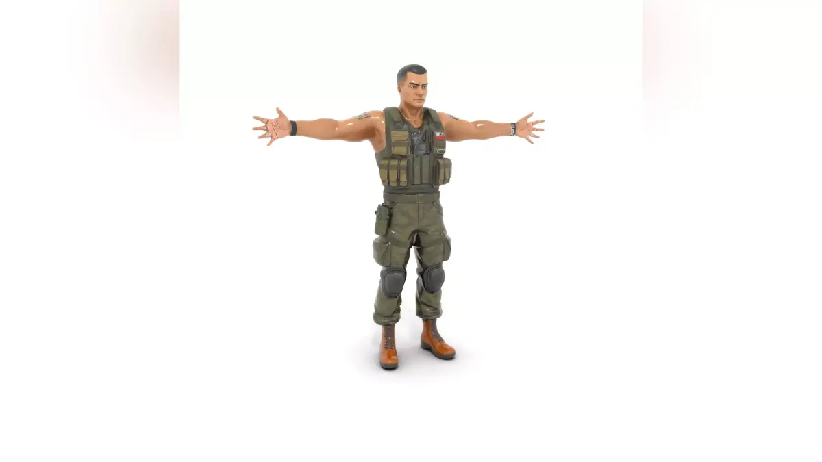 Game-ready character asset for real-time engines: ideal for gameplay, cinematics, and promotional renders, featuring clean materials and a practical combat outfit suited for modern combat scenes.Stylized realistic male special forces operator with a sturdy athletic build and a focused military look, wearing modern tactical gear: armored plate carrier with pouches, camo cargo pants with knee pads, utility belt attachments, and combat boots. Great for FPS, action, and military-themed projects where a clear, readable silhouette and authentic equipment details matter.