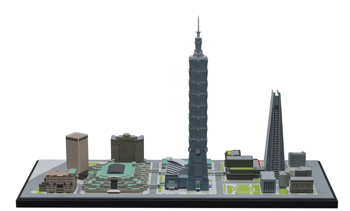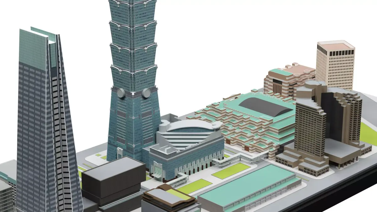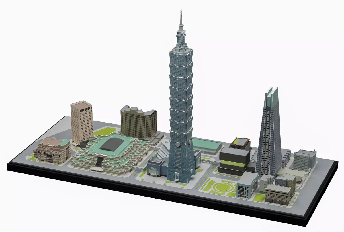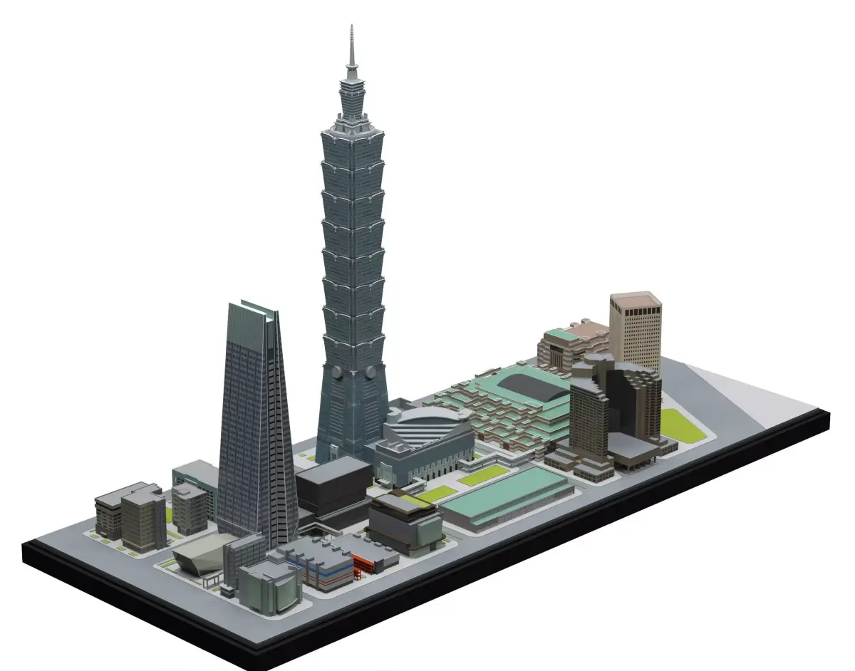 High-quality Taipei city scale 3D model featuring Taipei 101 and surrounding urban buildings. This model is designed in an architectural scale style, ideal for architectural visualization, urban planning, city renders, animations, and presentations.