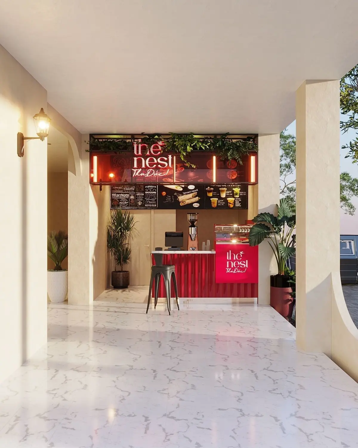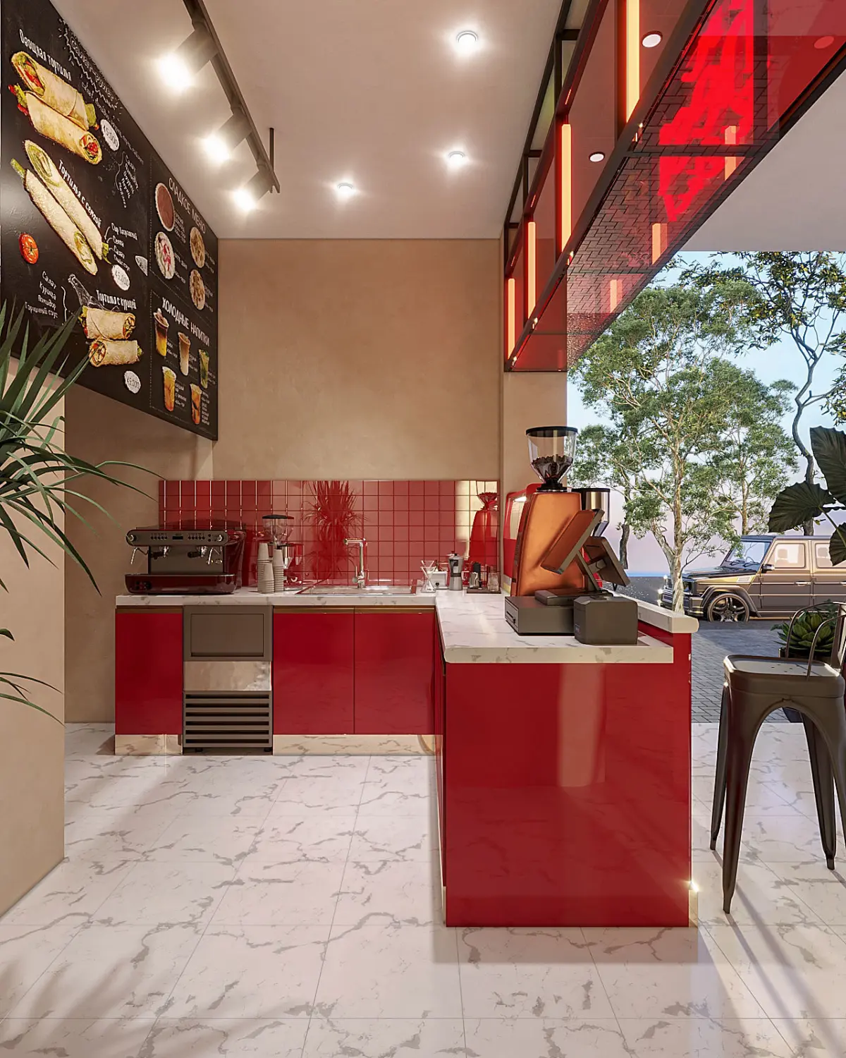 Pantone chose red as the color of the year 2023, so our client wanted to include it in their own take away coffee stand design as well.