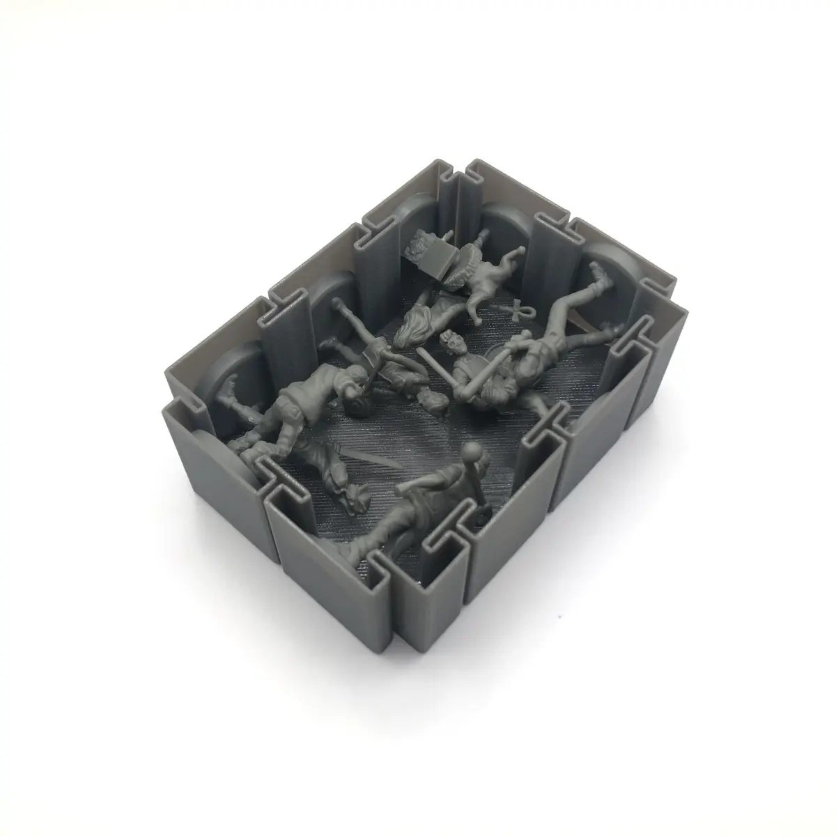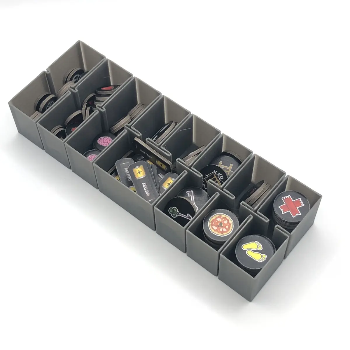 These are 3D printable inserts for the Tales of Evil board game, designed to organise the components (miniatures, tokens and cards) inside the original box.