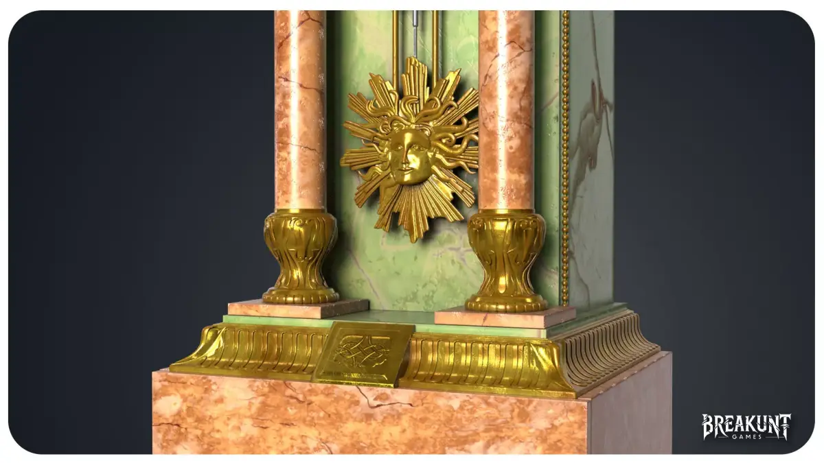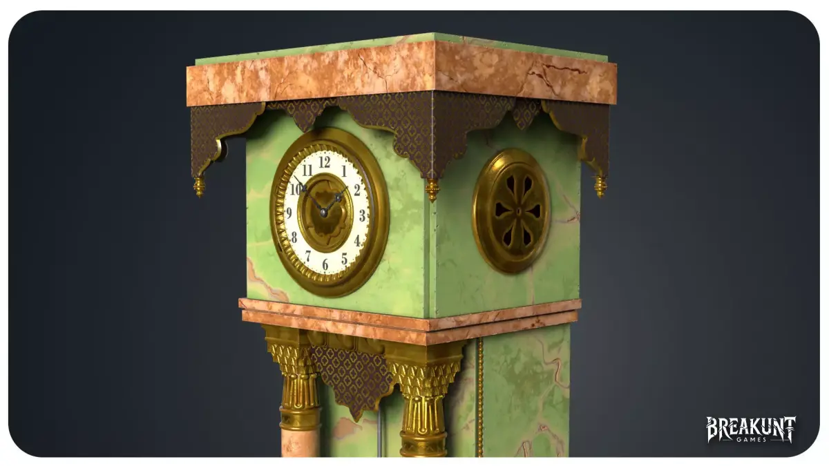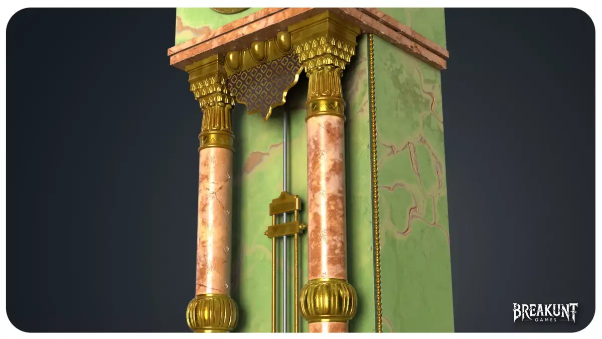 This realistic tall clock is a highly detailed antique-inspired piece designed around atall marble body, ornamental gilded elements, decorative columns, and a large lower pendulumarea. The model features a visible sun-face pendulum, a detailed clock face, side ornaments,and multiple layered decorative parts that give the asset a strong silhouette and a refinedearly-1900s character.The mix of green and pink marble tones with aged gold details helps the model stand out whilekeeping a believable historical look. It works well as a hero prop or as a strong decorativecenterpiece in interior scenes. The overall design is especially suited for historical environments,vintage mansions, luxury interiors, cinematic scenes, and other settings that need a rich andornate period clock.