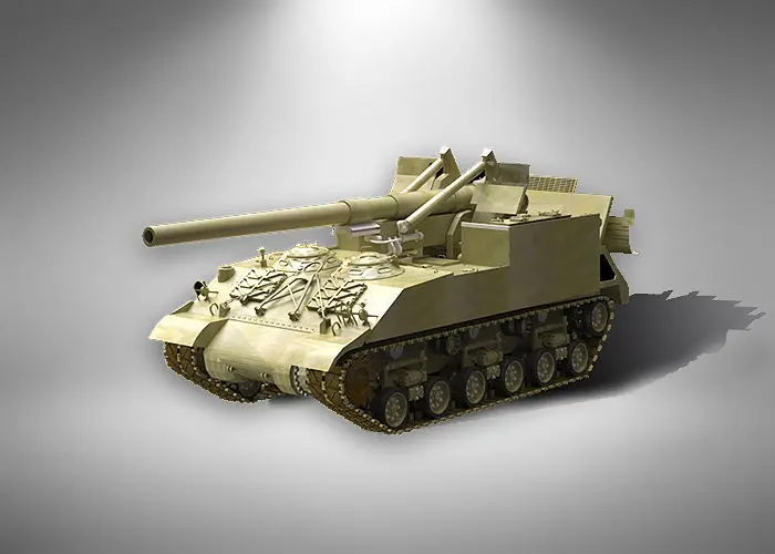 Development started in the spring of 1944 due to a shortage of M1918 guns for the M12. The vehicle was based on the M4 Sherman and featured a HVSS-type suspension. The design allowed the 155-mm M1 gun and 203-mm M1 howitzer to be interchangeable (an SPG with the latter was designated the M43). The vehicle first saw service during Operation Zebra. A total of 418 M40 and 48 M43 vehicles were manufactured (another 24 M40s were reequipped).