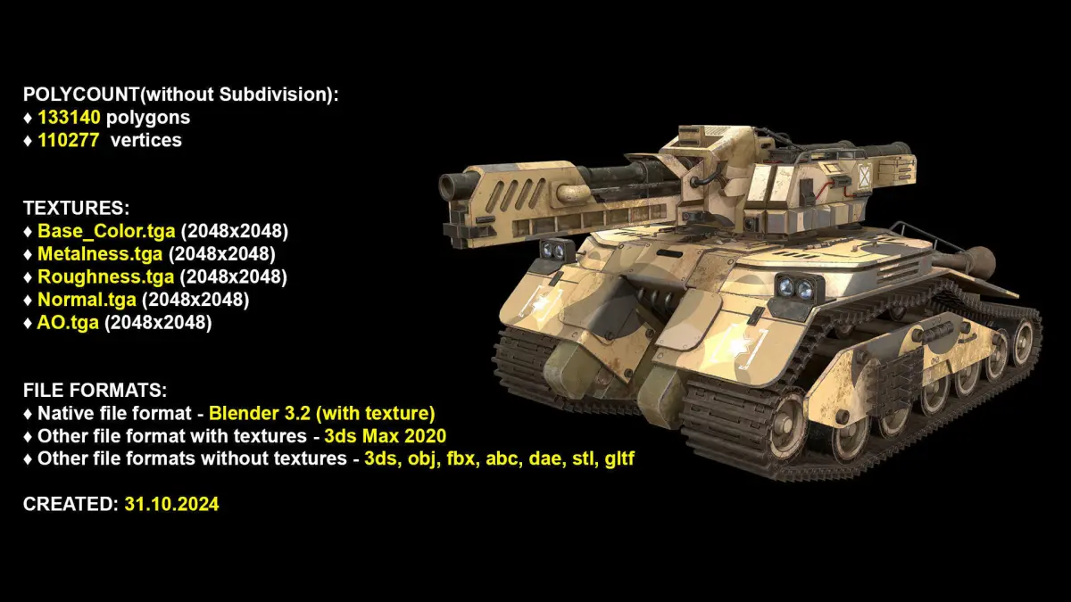 BLEND (Blender, filesize: 184 MB), OBJ (OBJ, filesize: 2.65 MB), FBX (Autodesk FBX, filesize: 5.86 MB), MAX (Autodesk 3ds Max, filesize: 187 MB), GLTF (glTF, filesize: 187 MB), DAE (Collada, filesize: 69.9 MB), USD (USD, filesize: 168 MB), OTHER (Other, filesize: 168 MB), ABC (Alembic, filesize: 3.18 MB), 3DS (3D Studio, filesize: 1.1 MB), STL (Stereolithography, filesize: 2.61 MB)