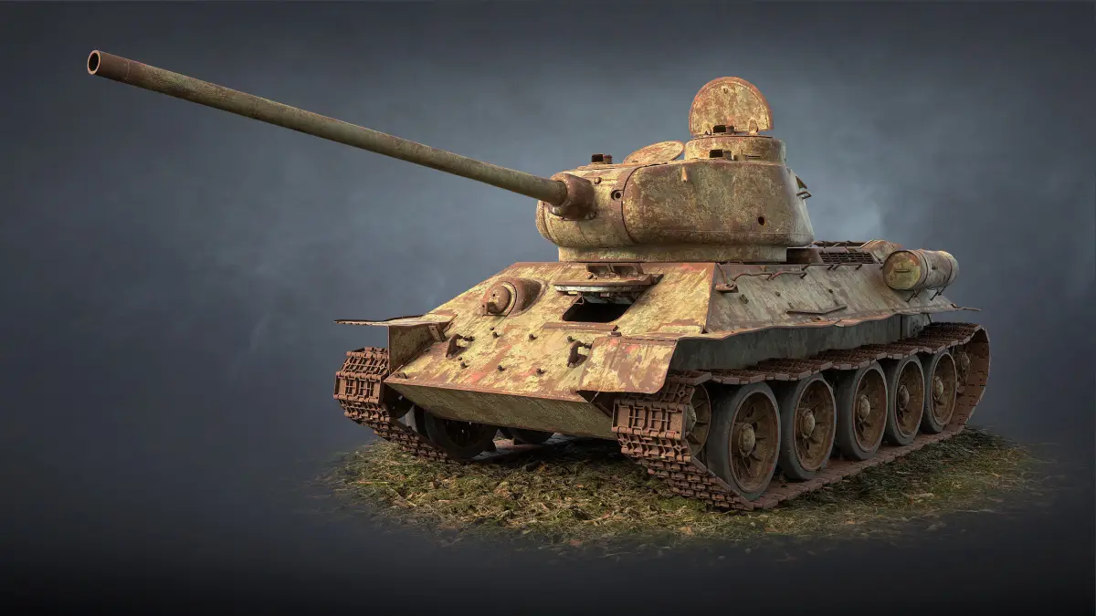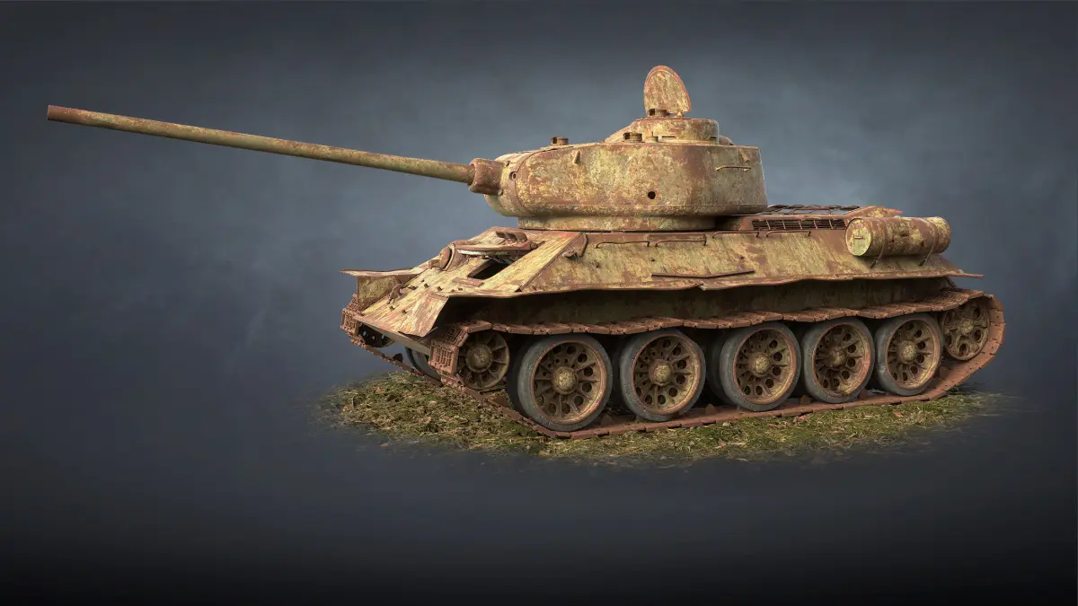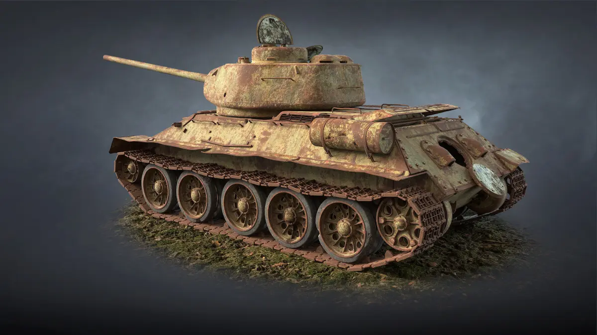 High-detailed customisable game 3d-model of abandoned tank T-34-85. Model has movable parts and interior. Any part can be used as single asset.