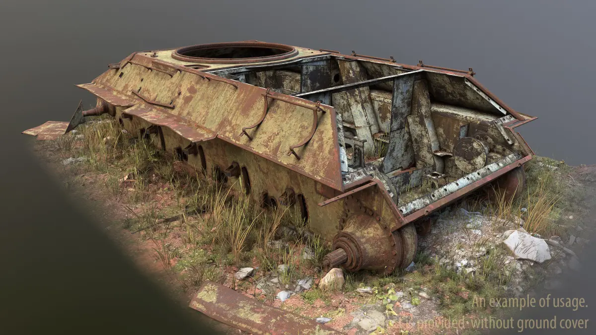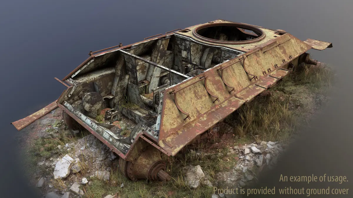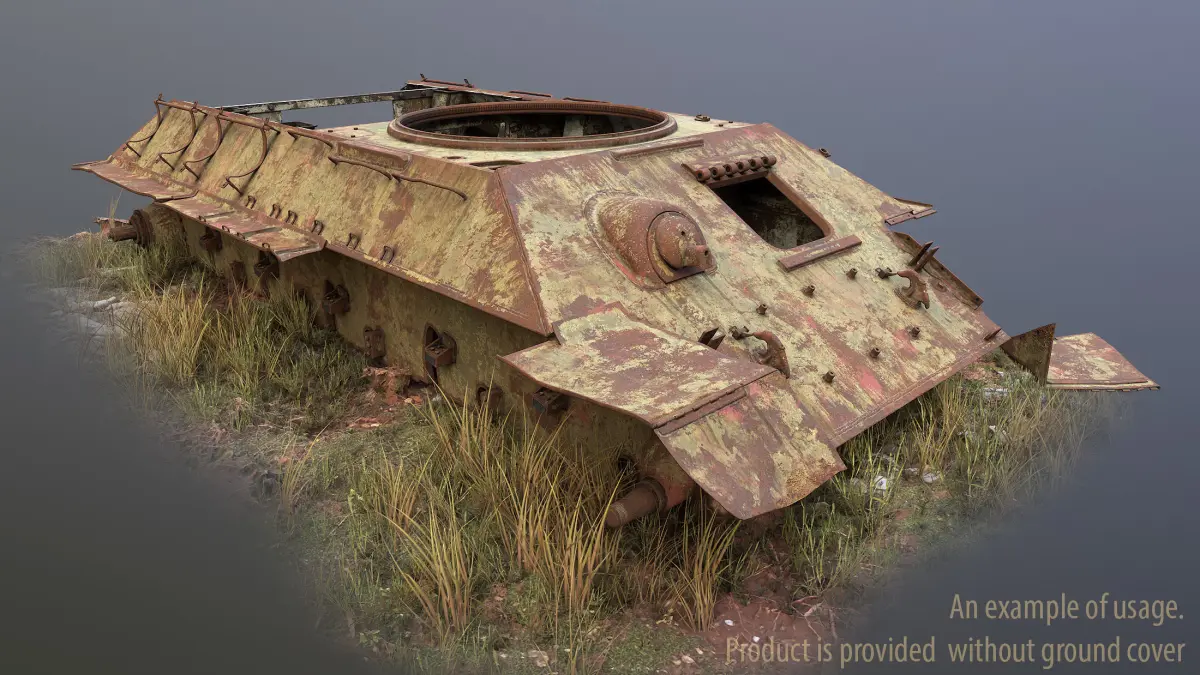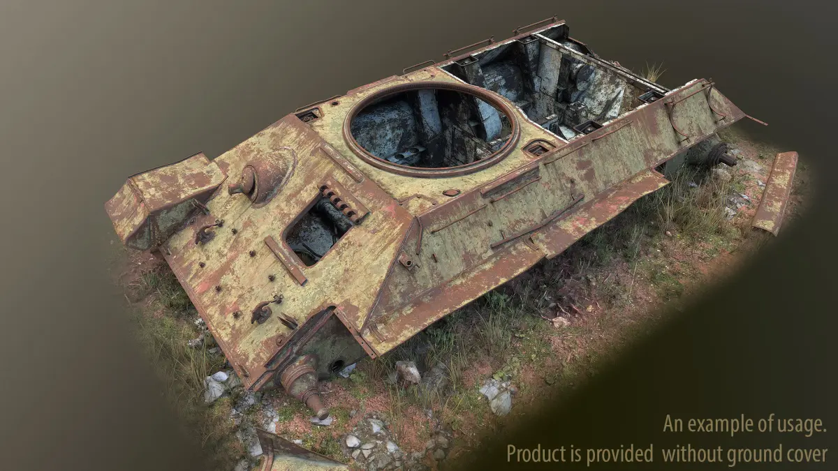 Detailed game ready 3d-model of abandoned rusry tank hull of Soviet tank T-34.