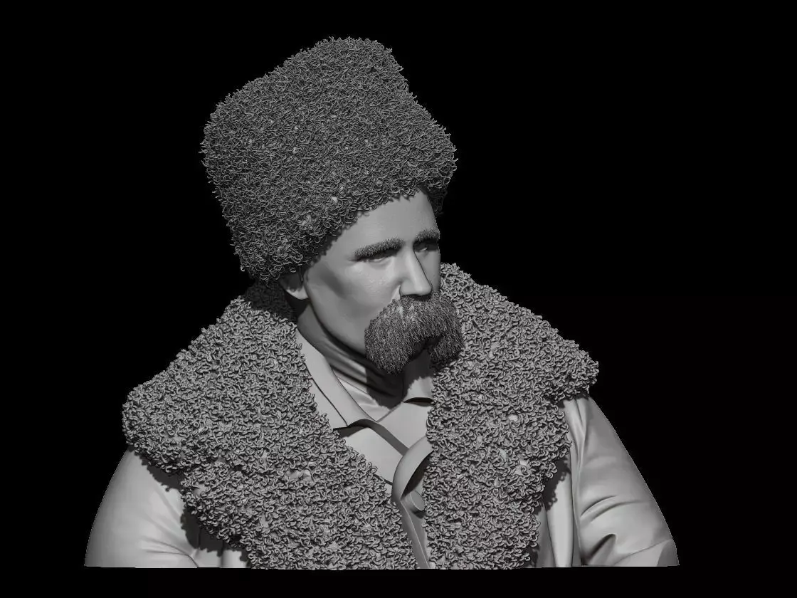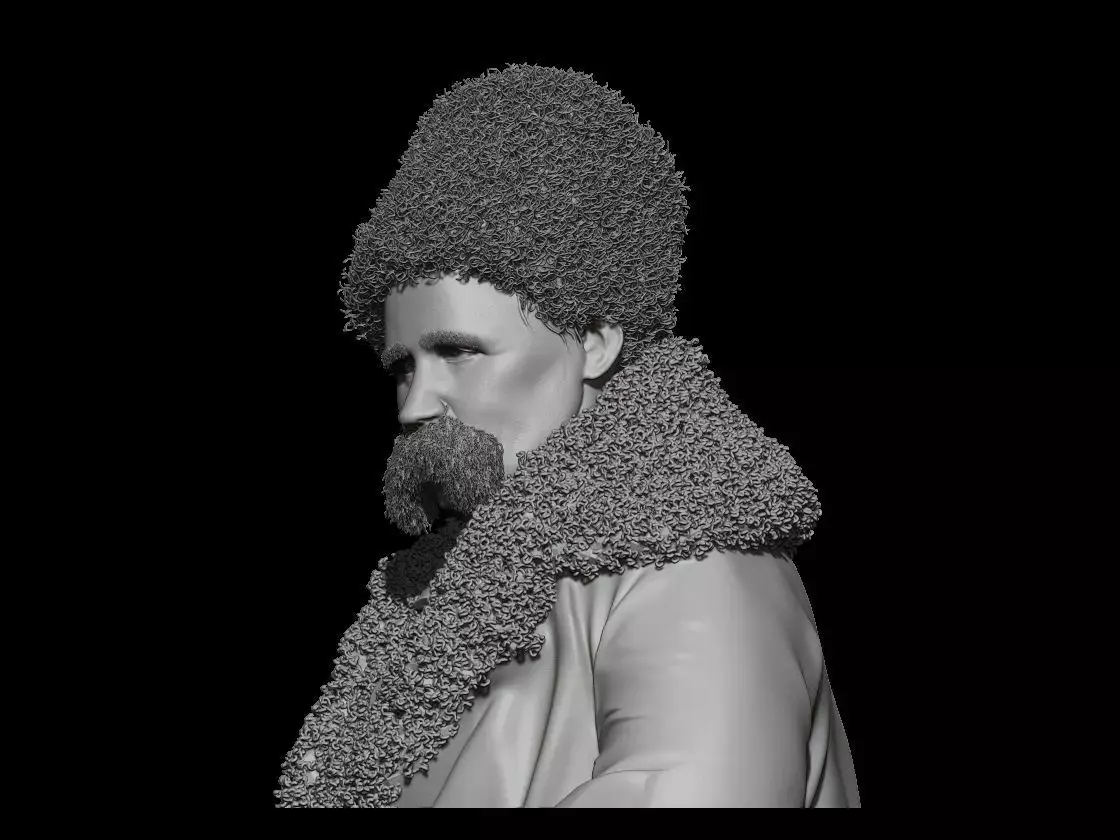 This is a highly detailed realistic 3D bust of Taras Shevchenko, meticulously sculpted over an entire month with great attention to accuracy and surface quality.The model features refined facial details, expressive anatomy, and a fully sculpted traditional outfit with complex fabric and fur structure.