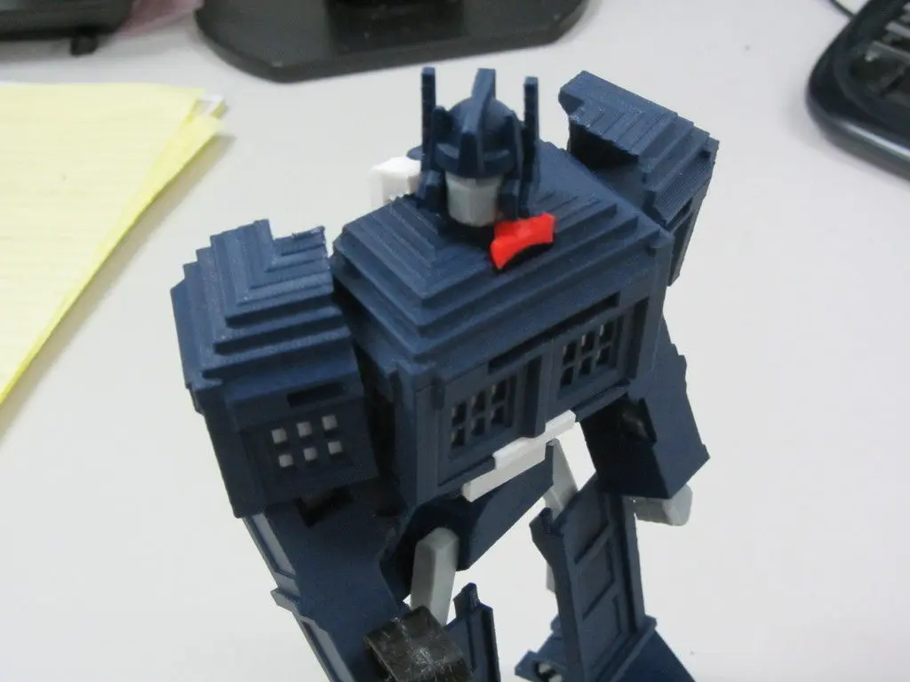 12/11/2013 update: Major tweaks for printability and easier transformation. I've added in a linkage between the abdomen and the head pivot so that the abdomen automatically slides up into the torso when the head pivots forward, and selective interference between the shoulder bars and abdomen mechanism to make the transformation process easier and more obvious. I eliminated all the fragile vertical tabs in the torso and shoulder blocks and made the shoulder ball-in-socket joint more robust. I have also completely redesigned the hips to make them easier to print and add a little bit of waist rotation. The legs and knees have been tweaked to stand more reliably and fit better together in Tardis mode. Also many other minor changes for durability and ease of priting and assembly.