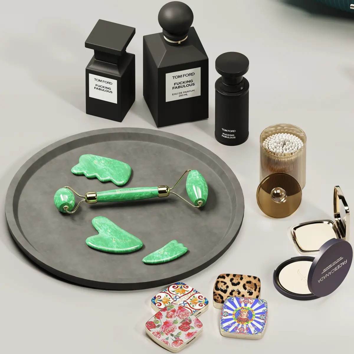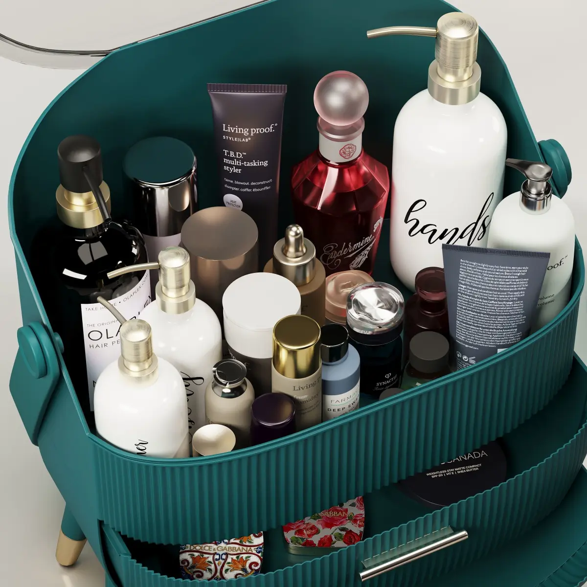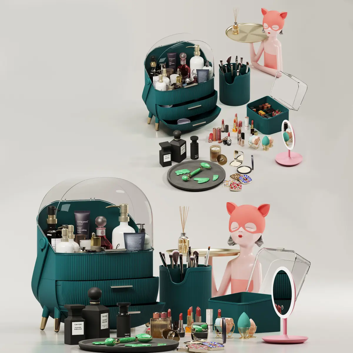 Composition with cosmetic table and Portable cosmetic bagAll elements of the set have high detail and high-quality textures. The set is suitable for visualization of close-ups.Included:-portable cosmetics Box-farmacy-Living proof no frizz Vanishing Oil 50 ml-Living proof STYLE|LAB amp2 Texture Volumizer leichter Halt 57 g-living proof perfect hair day-Living Proof Style Blowout 148ml-living proof humidity shield-living proof nourishing styling cream-living proof t.b.d. multi-tasking styler-living proof full shampoo-LIVING PROOF Humidity Shield Spray capillaire-Living Proof - Trattamento di styling PHD 5-olaplex hair perfector-SHISEIDO EUDERMINE Revitalizing Essence 150th Anniversary Limited Edition-Shiseido BENEFIANCE WRINKLE SMOOTHING Day Cream SPF25-Decorative-girl doll-dolce & gabbana pancake-tom ford fuking fabulous-Rose synactif-korner radiate presence day cream-korner skincare-Stone Massage kit - Face Roller beauty by earth-TAULA Flower Essential Oil-Eono Makeup Brushes-Amazon Brand – Eono Eyebrow Brush and Spoolie Professional Angled Duo Makeup Brush Spoolies Perfect for Lining Shaping Brows and Lashes-FRANGIPANI ESSENTIAL OIL-Dear dahlia lipstick -Dior lipstick-dolce & gabbana lipstick-Milani lipstick-L'Oréal Paris lipstick-Tom Ford lipstick -Tory Burch lipstick -Lancome paris lipstick_french bisou-Lancome paris lipstick_french lover-Lancome paris lipstick_french romance-facescanada Weightless Stay Matte Compact SPF20 Vitamin E & Shea Butter-Pola white shot-Henry rose-Hand wash-Makeup Sponge Cosmetic Puff & spring base & basic heart design-Table mirror with LED-EAU DE TOILETTE HOTEL COSTES 125ML-Burberry lipstick-Nest fragrances new york-cotton swab