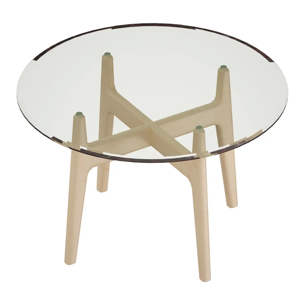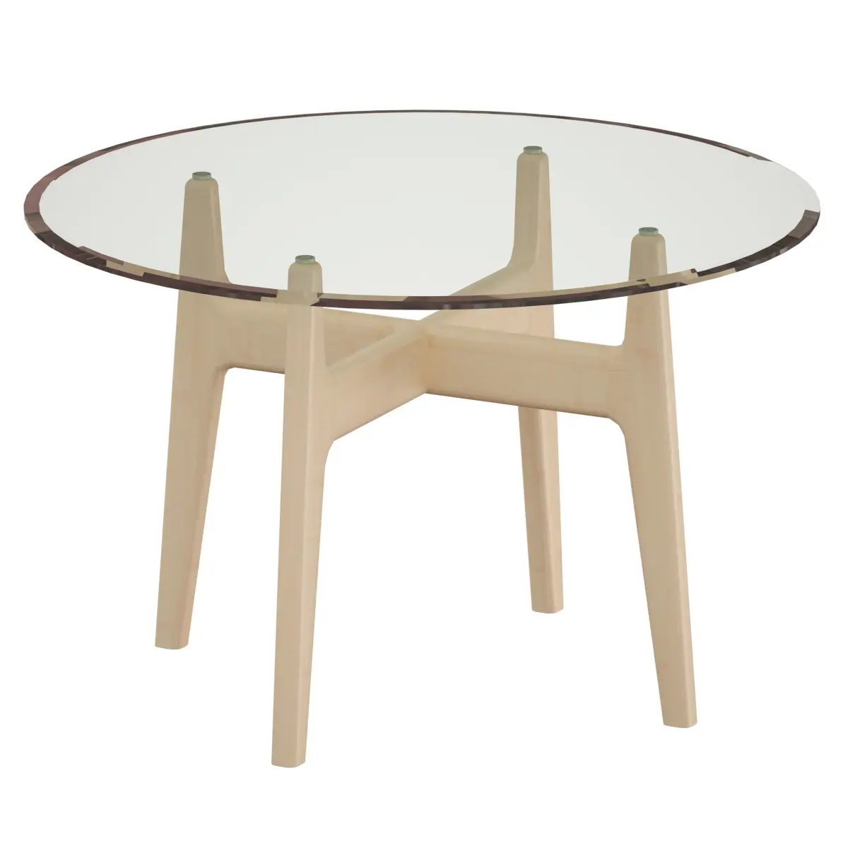 Tate 48 "Round Dining Table with Glass Top and Sand Base (Crate and Barrel). Tempered glass top with warm, light hardwood base.