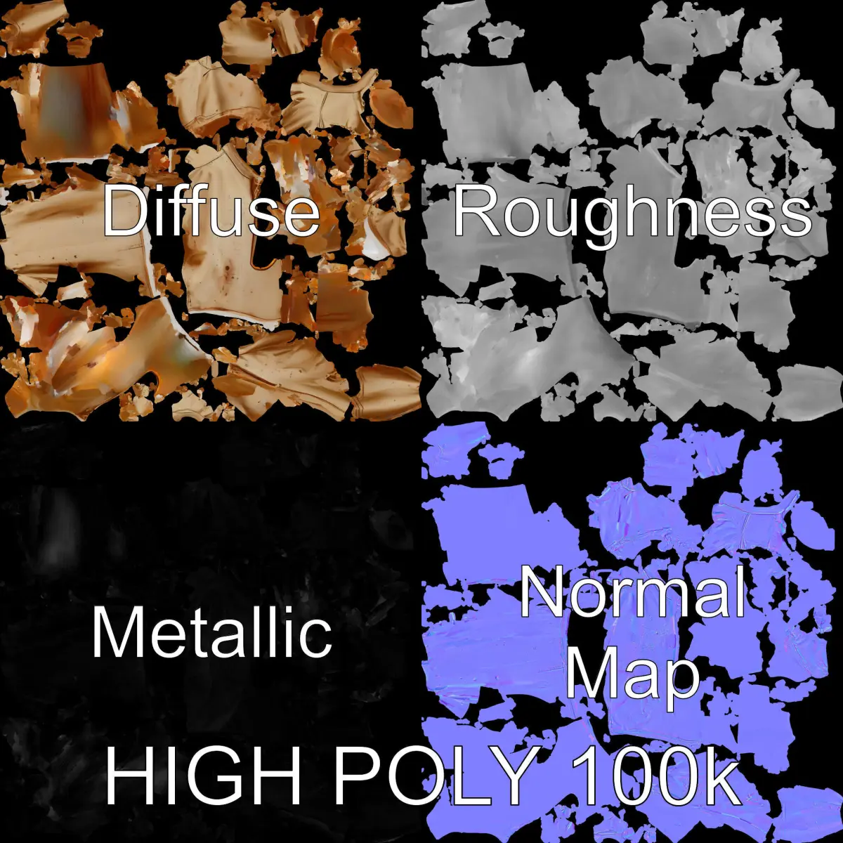 This 3D model pack features a tattered vintage shirt with stunning attention to detail. It includes three levels of detail: low-poly (1000 triangles) for mobile, middle-poly (10,000 triangles) for environments, and high-poly (100,000 triangles) for production rendering. The model is perfect for use in video games, animations, or interactive presentations. Textures include PBR, Diffuse, NormalMap, and reflection/roughness/metallic, all at 4096x4096 resolution, ensuring high-quality visuals in any modern rendering engine. Accurately unwrapped with no overlapping UVs, this model is ready for seamless integration. The first image is the reference used for creating the 3D model. It is important to carefully evaluate the quality of the model by examining the preview images that display the topology and polygonal mesh. These previews (WIRE and WEB 3D Preview) clearly demonstrate how accurately the model matches the original reference and how well the geometry has been executed. Please like and leave a comment if you enjoy this model pack.