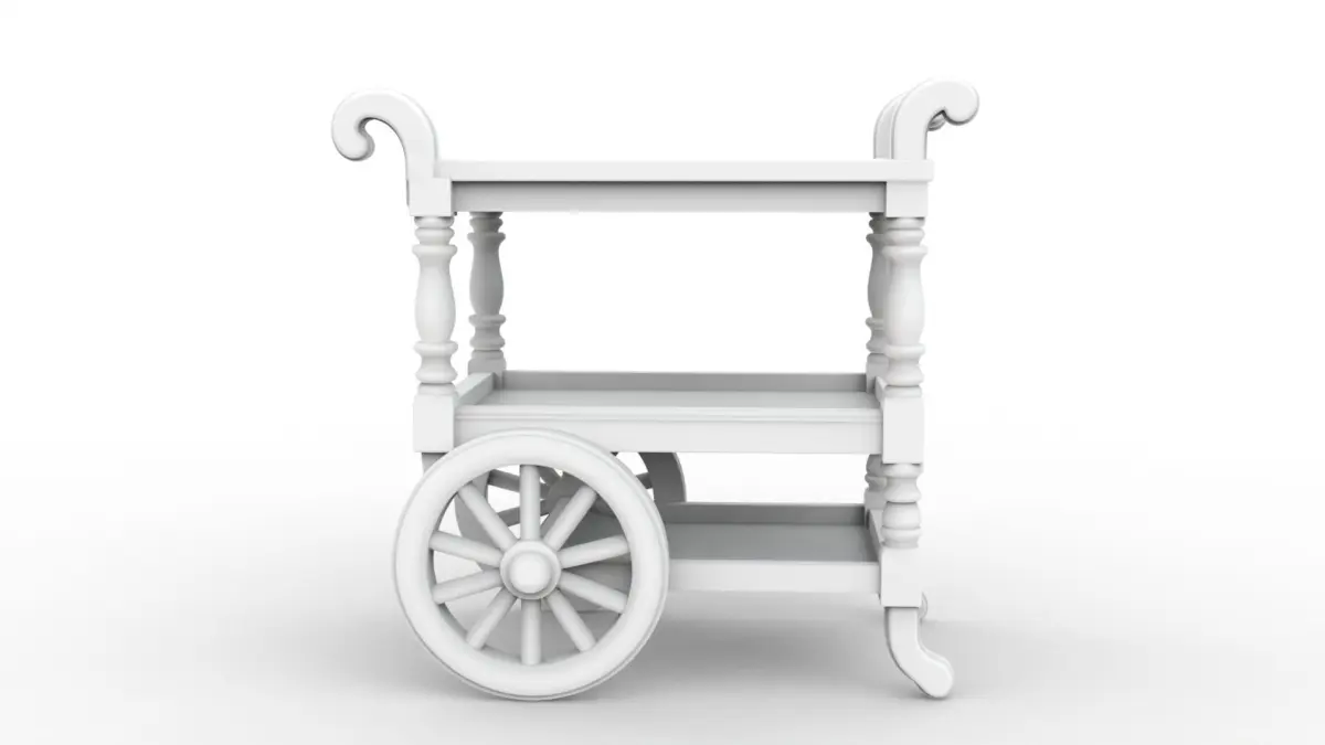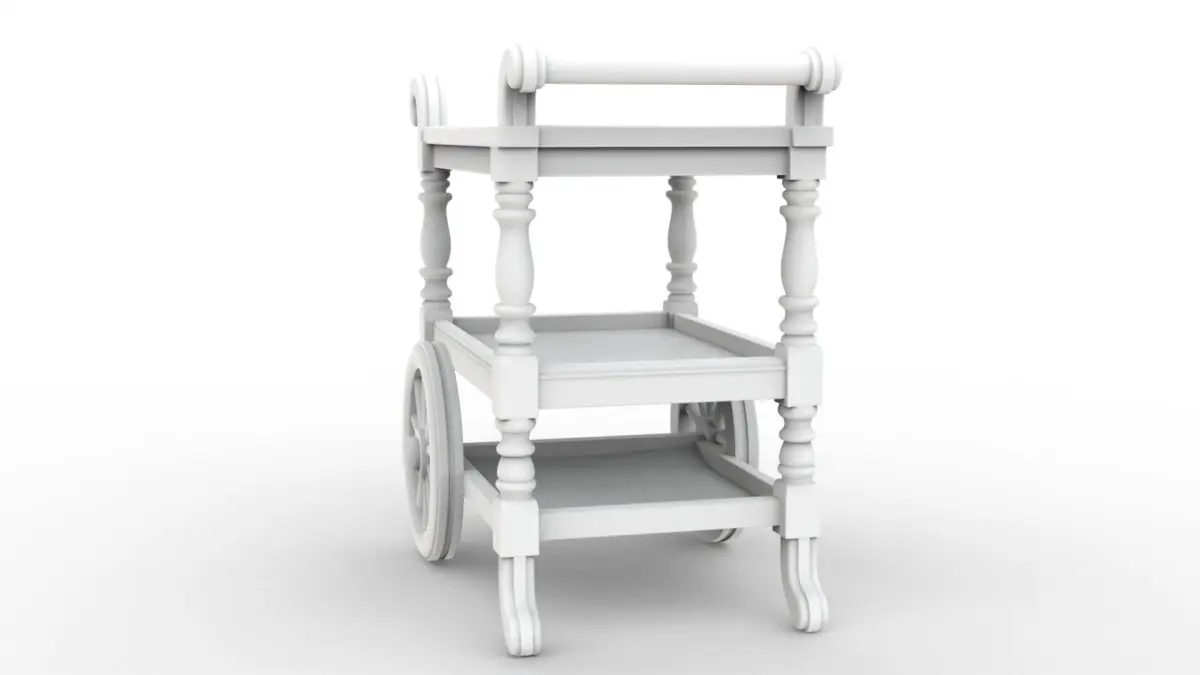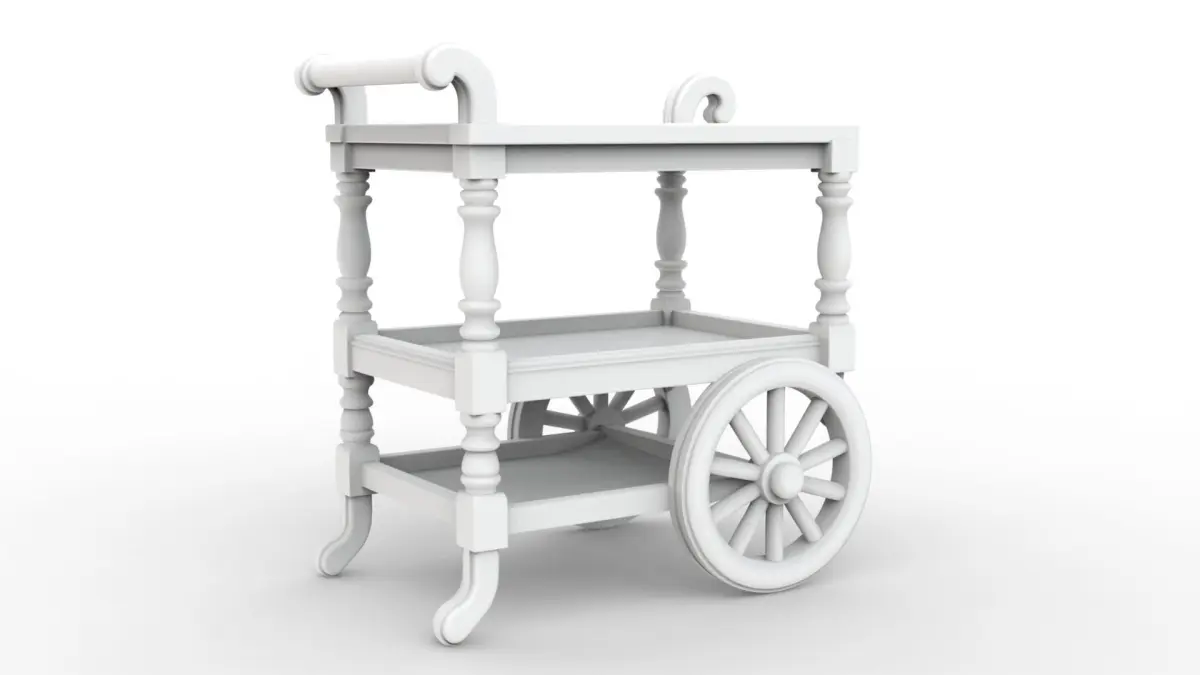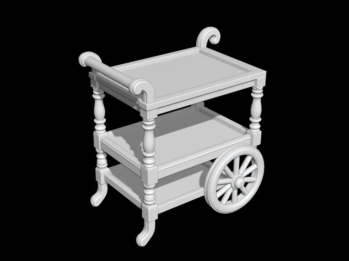 Victorian Tea Cart 3D ModelDetailed three-tier tea cart model featuring classic Victorian design elements.Perfect for dollhouse furniture, miniature collections, and period-accurate displays.Includes intricate wheel details and ornate decorative elements.