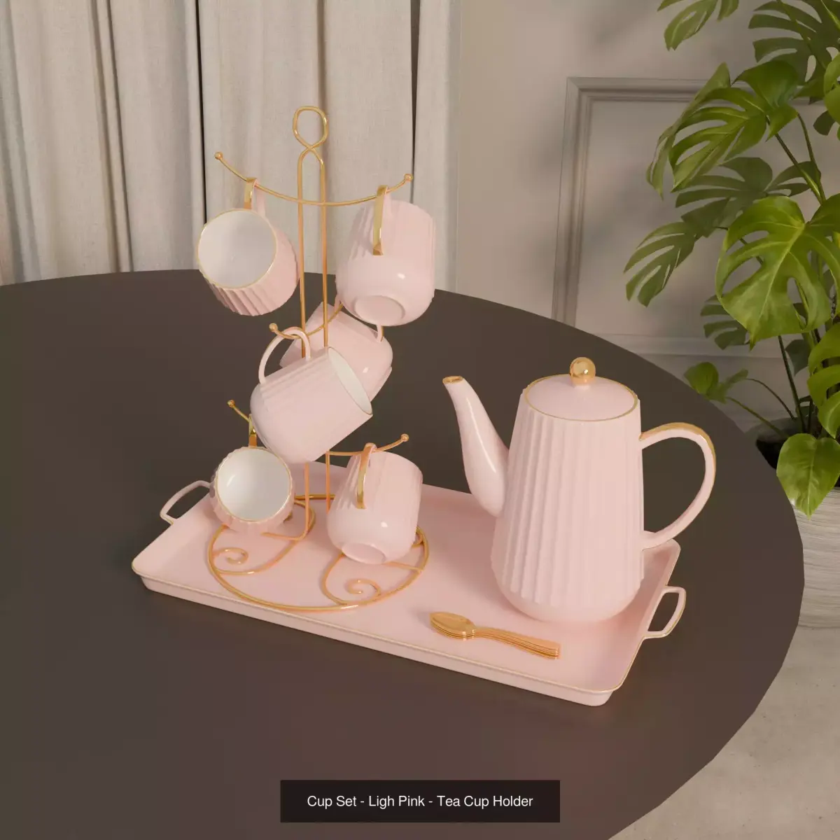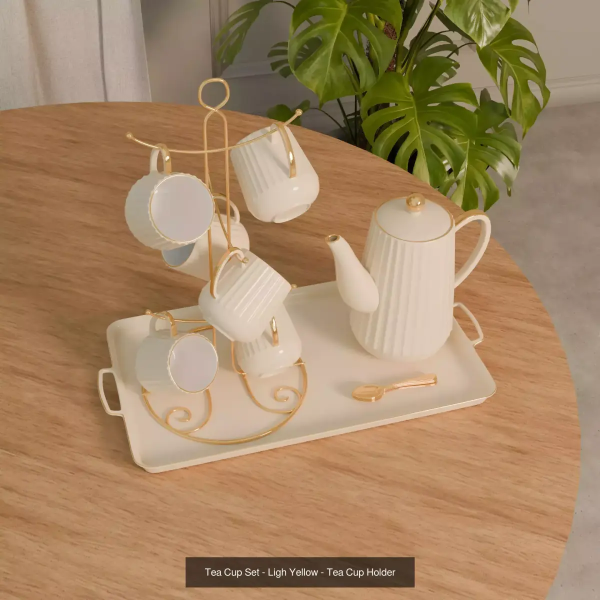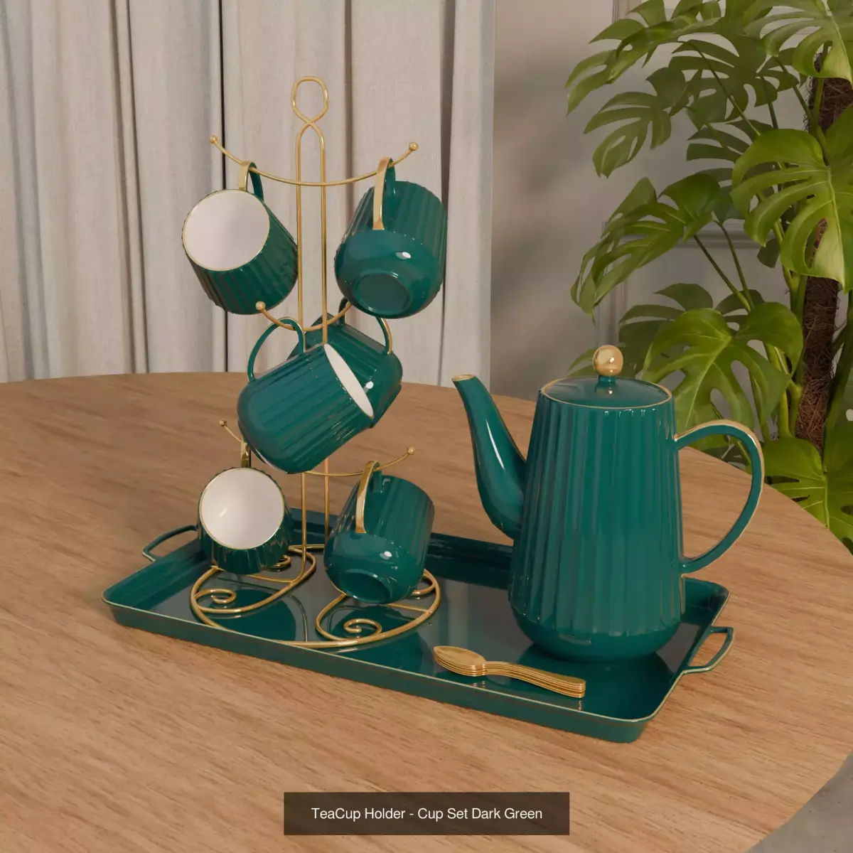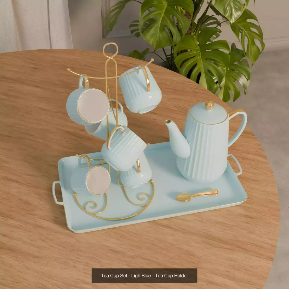 This collection includes four variations of a beautifully detailed cup set with tray and stand, each featuring a unique color scheme.Designed with realism and precision, every model maintains the same elegant design while offering a different aesthetic to match any interior or render style.