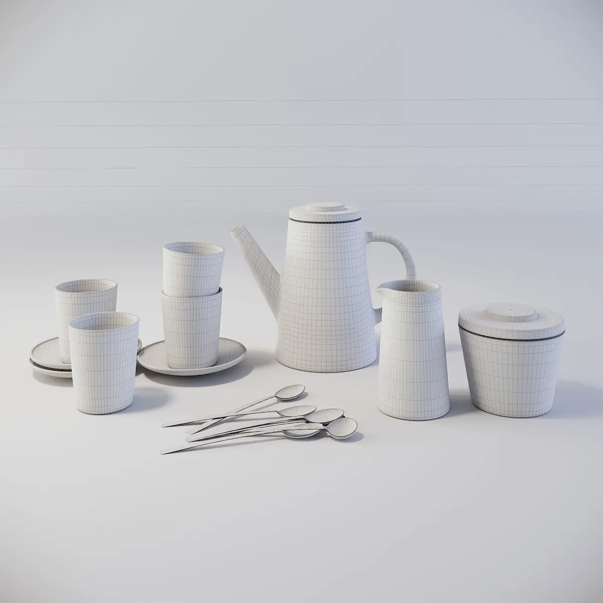 TeapotTeacupSaucerCreamerSpoonSugar bowl