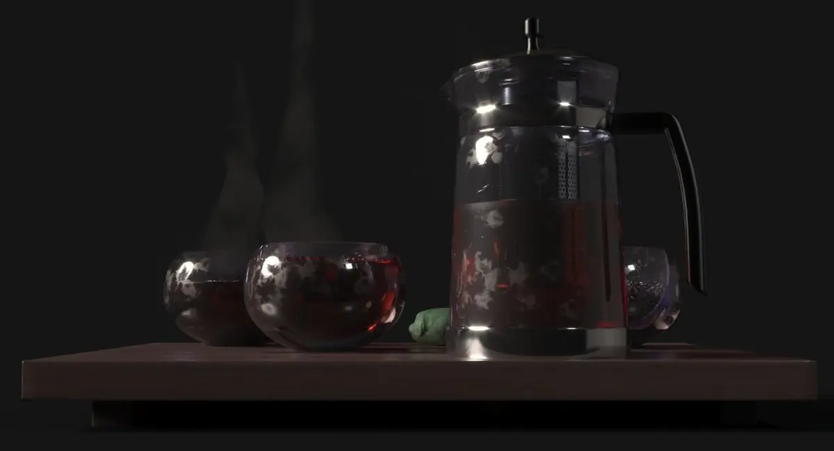 One dried tea leaf consists of 130 polygons, does not need to be subdivision, includes a map of normals and ambient occlusion. Total 6 different leafs, copied and poured with MassFX.Pig figurine have Diffuse, Glossiness, IOR, Reflection, Normal textureAll parts have been unwrapped and only steam over bowls dont have UV`s.