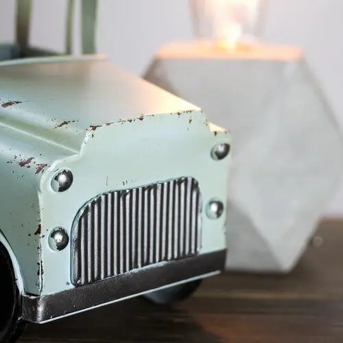 - Showcase classic Americana with this vintage-inspired teal pickup truck. This weathered and distressed piece is sure to mix in well with your farmhouse-themed decor. Measuring 7'' H x 5.5'' W x 12'' D, it offers a bit of storage in truck bed, perfect for keys, loose change, mail, or even a small plant. A great way to add charm and personality to a room, this rustic tabletop accessory is ideal for an end table, coffee table or nightstand.