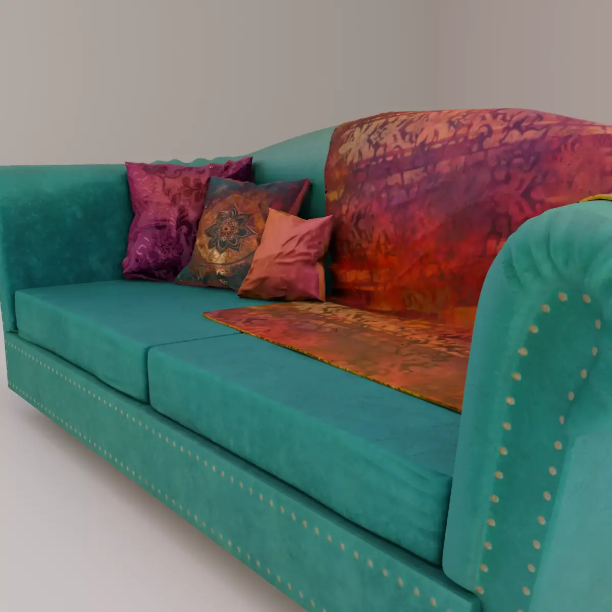 Teal Velvet Chesterfield Sofa with decorative throw and pillows. High-quality 3D model, detailed textures, perfect for interior visualization, rendering, and design projects.