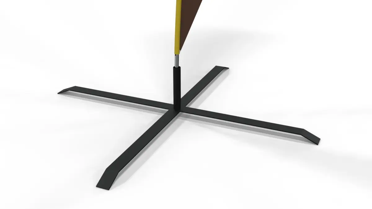 This 3D model represents a 220 cm tall teardrop banner flag designed for commercial, retail, and promotional environments. Its compact format and curved silhouette make it ideal for high-impact visual communication in both indoor and outdoor settings. The model includes a cross-shaped metal base for stability, a vertical pole, and a fully mapped teardrop-shaped graphic banner.