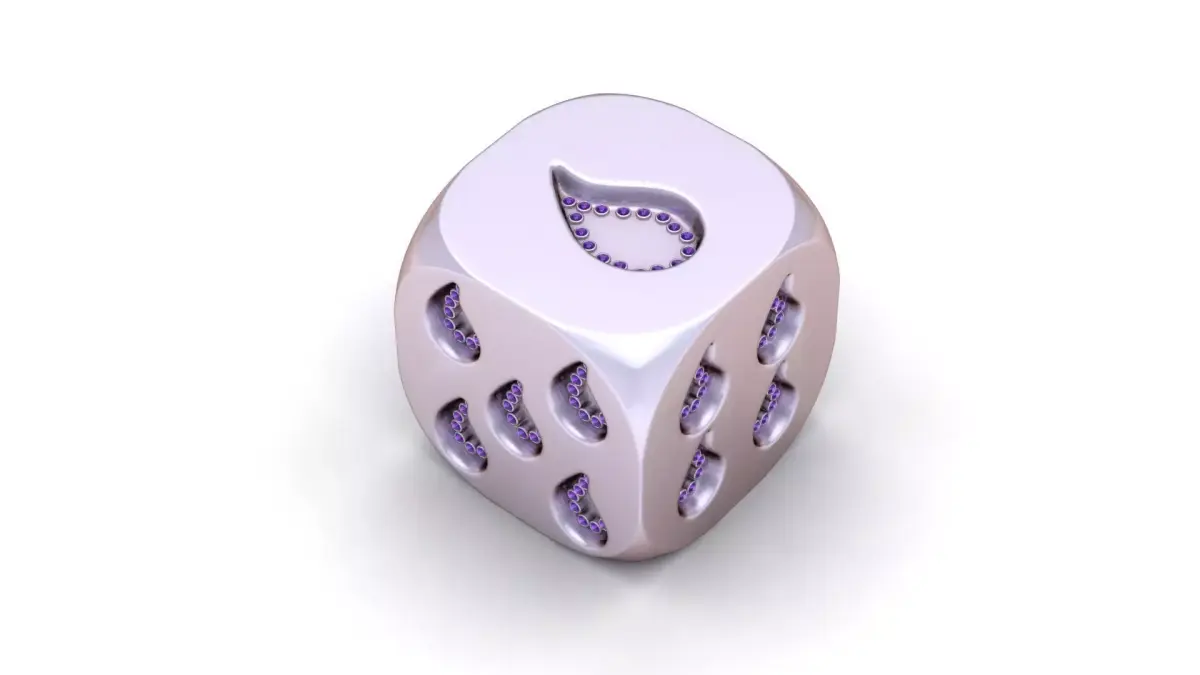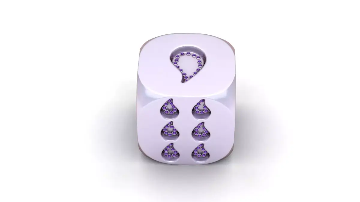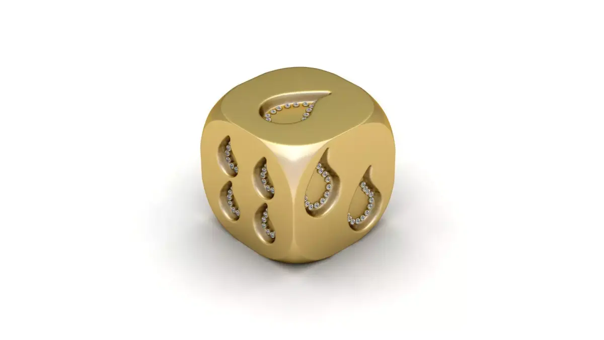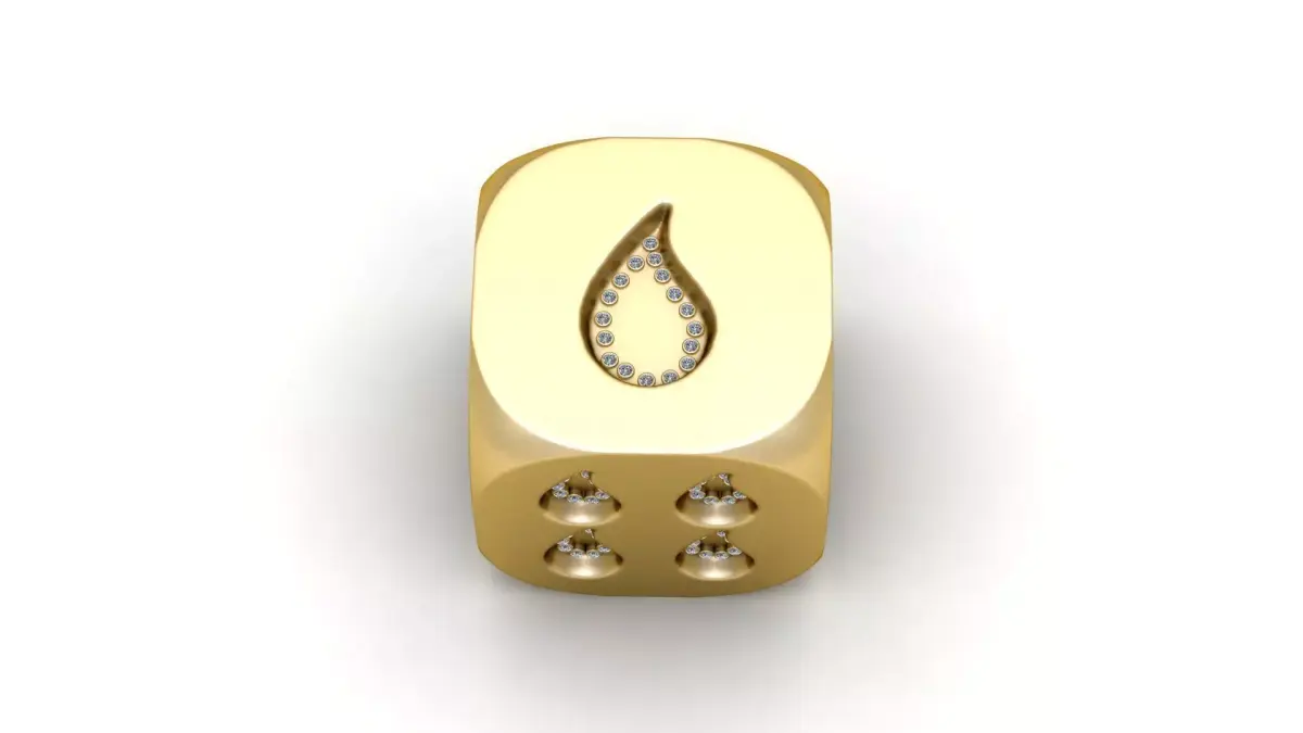This unique gold designer dice showcases a captivating twist on tradition with teardrop-shaped pips, each encrusted with sparkling diamonds. Bold yet elegant, the number markings flow in a soft droplet pattern, symbolizing grace, fluidity, and transformation. The polished finish and rounded edges give it a luxurious feel, making it the perfect collectible, good-luck charm, or high-end desk accessory for those who appreciate artful detail and symbolic beauty