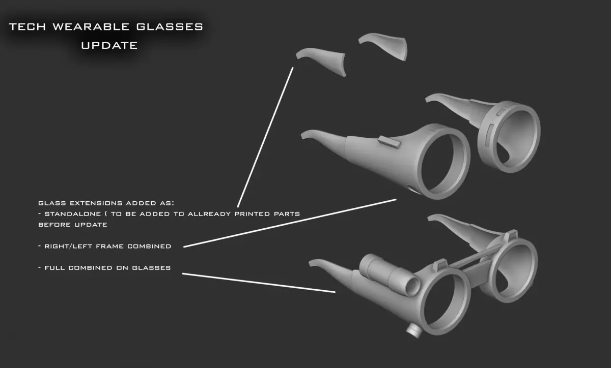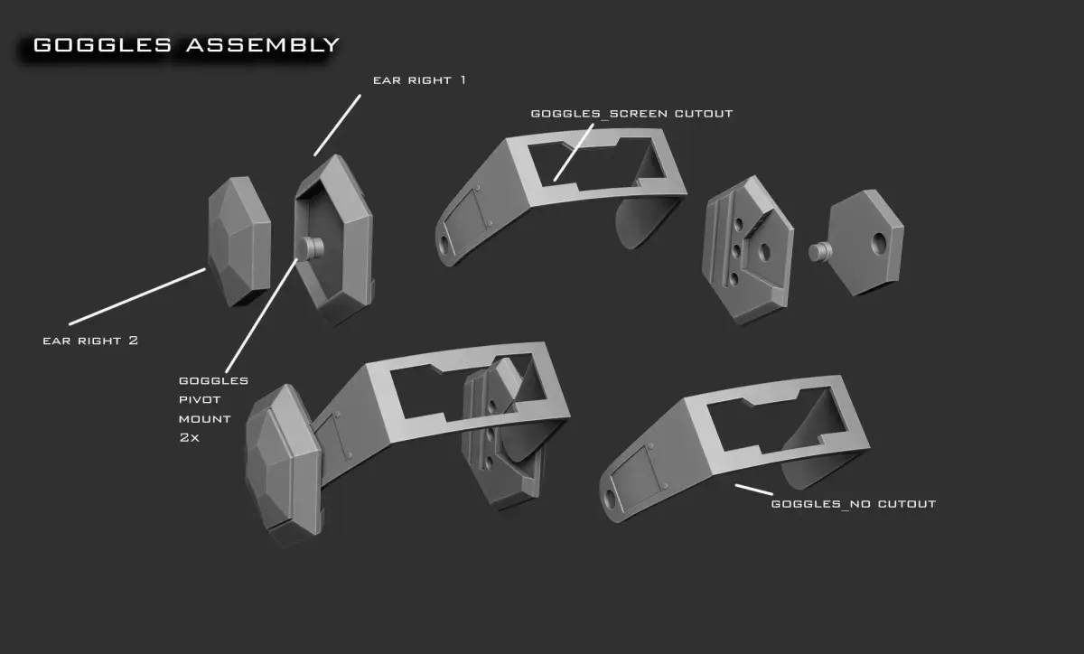 So the ear mechanism is assembled as you can see in the photos, i added magnet pins to keep the goggles up , i also added a screen cutout on the googles so you can insert that yellow glass.