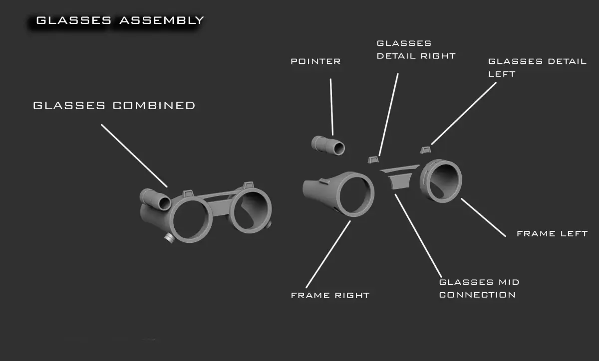 Glasses are flattend on the sides so you can attach the strap to it as it is intended, and the little pointer is hollow so you can insert some sort of light. The glasses can also fit lenses and i aded a separated version so its easier to print.