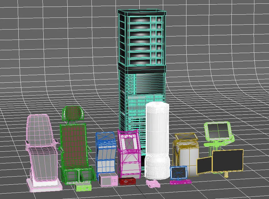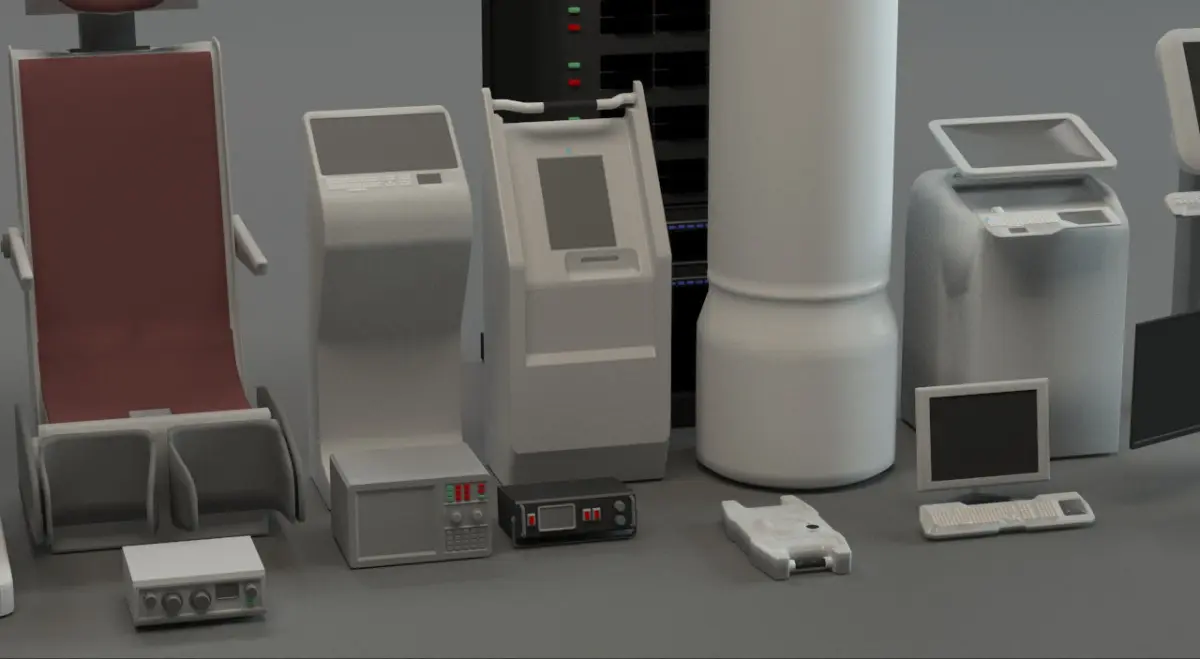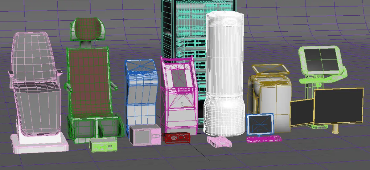 Models created for a 3d Animation (see preview) and then optimized and modified into single closed meshes which could be used in games, powerpoint, 3D print with scaling alterations. A mixture of interfaces, support machines and furnishing for control room or lab type environments.Materials are just 3Ds max standard colours, not external textures or effects applied.