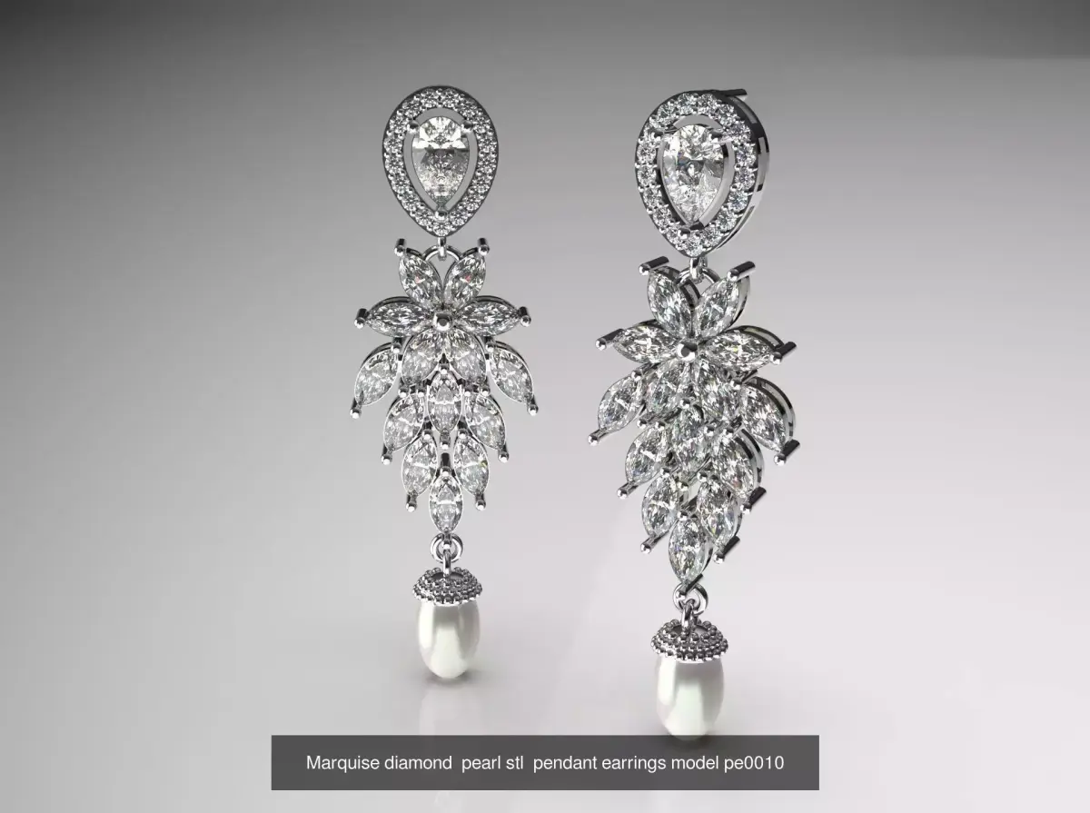 2. Formal and fancy designs (Statement & Fancy)| Design code | Earring type | Metal material | Main pendant stone | Secondary stones and decorations | Design style || :--- | :--- | :--- | :--- | :--- | :--- || PE0010 | Long Pendant | Polished White Metal | White Drop Pearl. | Marquise and Teardrop diamonds galore, with a single teardrop diamond at the top and a halo of round diamonds. | Cascade; Floral Cluster design with a movement and fall effect. || PE0044 | Long Pendant | Two Tone Gold (Yellow and White) | Soft Pink Spherical Pearl. | Teardrop or Red Marquise Center Stone (like Ruby/Garnet), surrounded by a gold Lattice pattern and round diamonds. | Oriental/Moroccan; Filigree and geometric design with contrasting gold and red stone. || PE0026 | Long Pendant | Two-tone gold (yellow and white) | Soft pink teardrop pearl. | Red round cut center stone, below it Turquoise oval, and pearl cup covered with round diamonds. | Bohemian and colorful; Use of three different stones (red, turquoise, pearl) in a modern structure. |