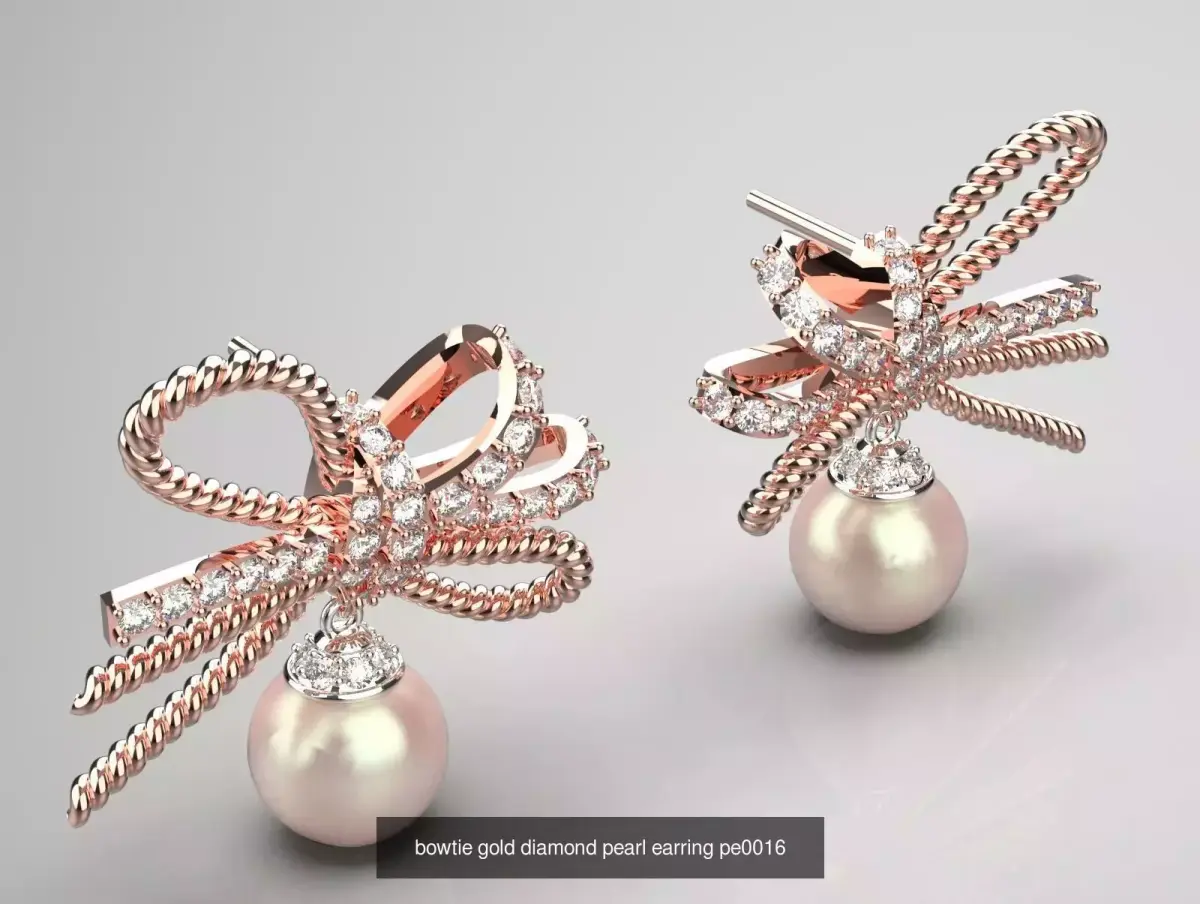 1. Classic and Bow Designs (Bow & Classic)| Design Code | Earring Type | Metal Material | Main Pendant Stone | Secondary Stones and Decorations | Design Style || :--- | :--- | :--- | :--- | :--- || PE0001 | Pendant (Drop) | Polished White Metal | Soft Pink Pear/Drop Pearl. | The entire surface of the bow element and fittings is covered with round cut diamonds. | Classic and voluminous bow; The diamond-encrusted bow is placed above the pearl. || PE0016 | Drop | Rose Gold with Twisted Rope finish. | Soft pink spherical pearl. | Small round diamonds on the bow and pearl cup bands. | Delicate and romantic bow; The bow is designed with a rope texture. || PE0003 | Long pendant | Polished white metal | Dark teardrop or oval pearl (such as Tahitian pearls). | Round stones (diamonds) in a Filigree arrangement in the form of connected rings. | Victorian and formal; Large and worked in the form of a crown pendant. |