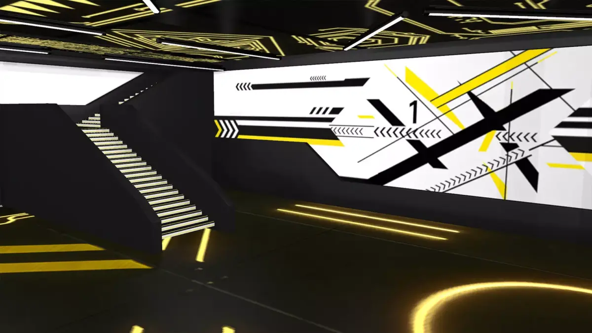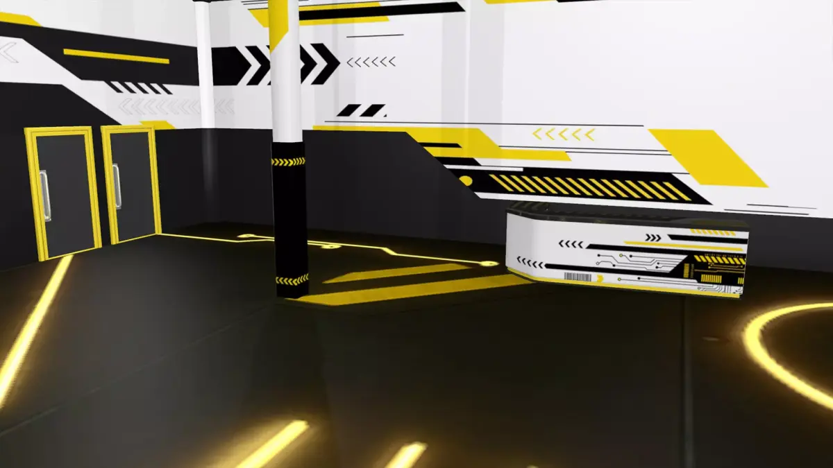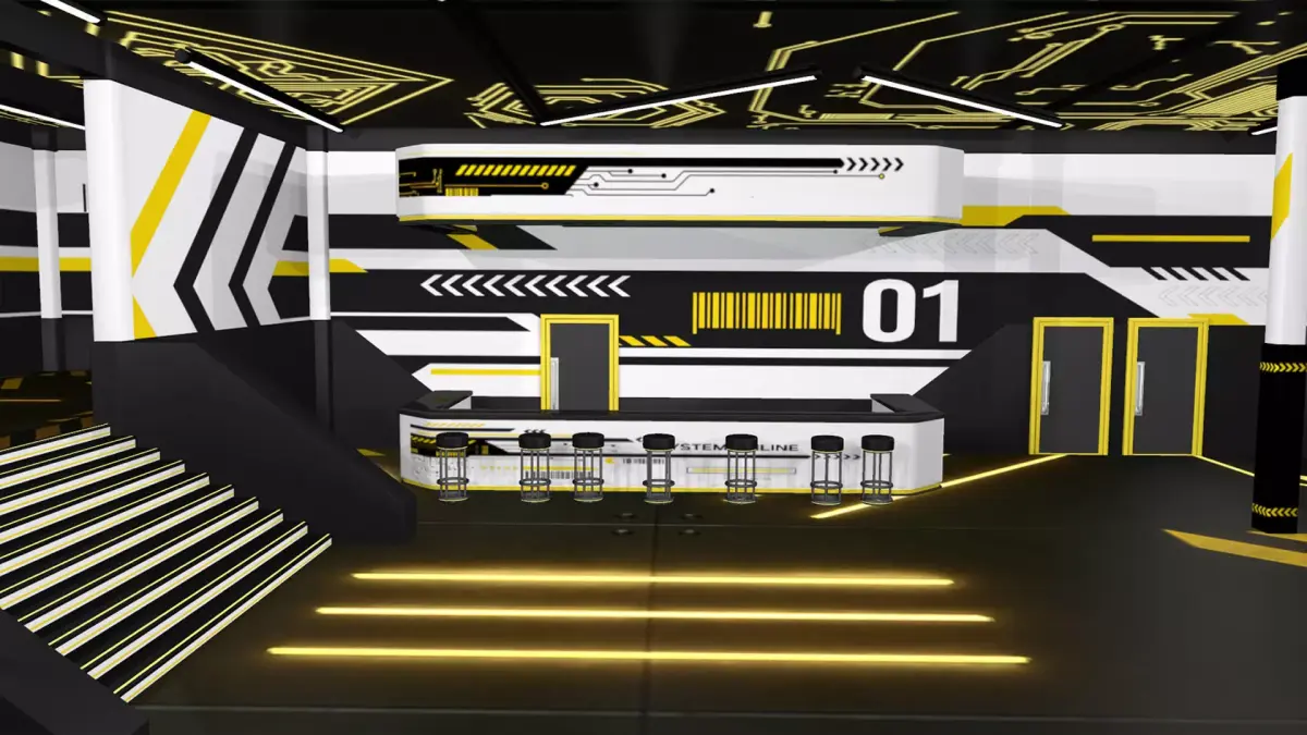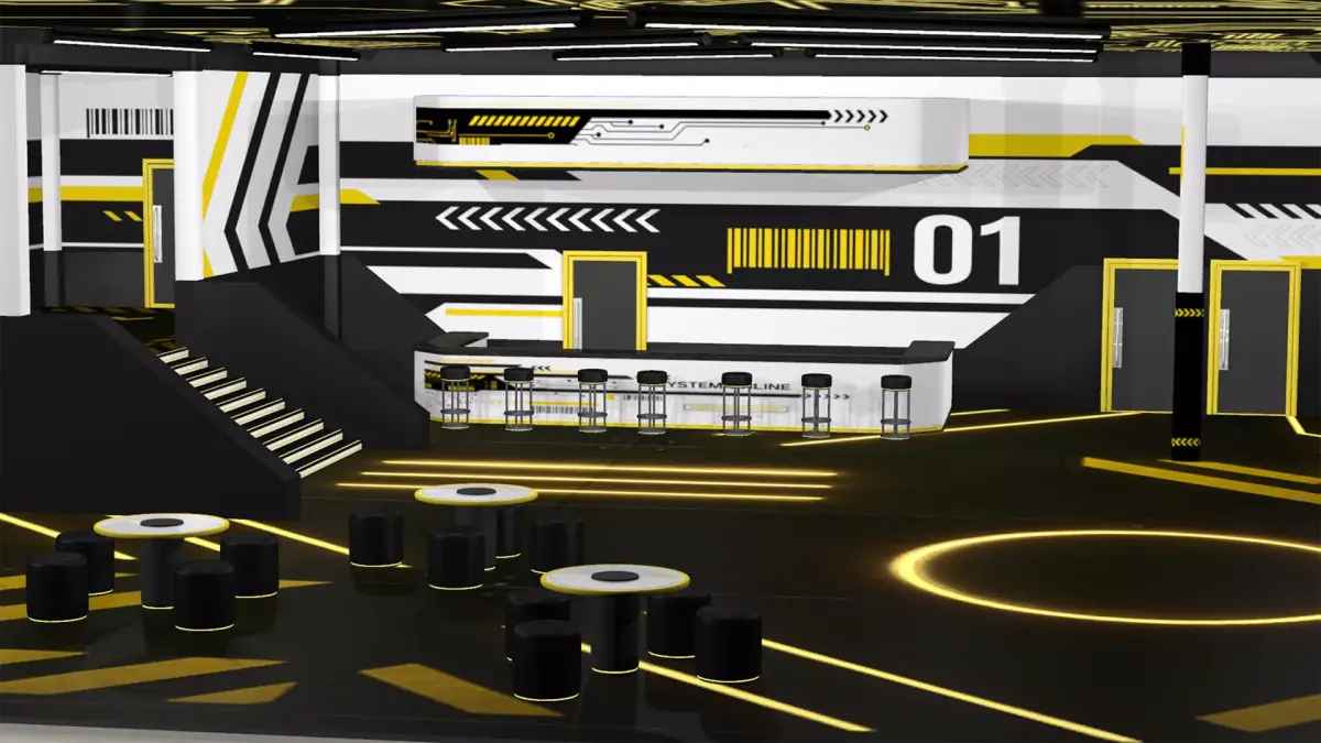 3D model of a versatile single-story commercial unit interior in a techno-minimalist futuristic style. With a vectorheart/cyberpunk/y2k/techno aesthetic.Features a split-level entrance, clean geometry, and decoration elements. Ideal for use as a bar, shop, gym, etc.
