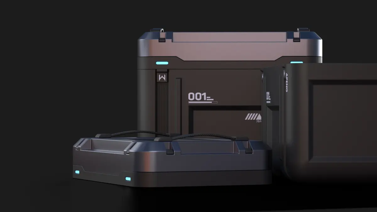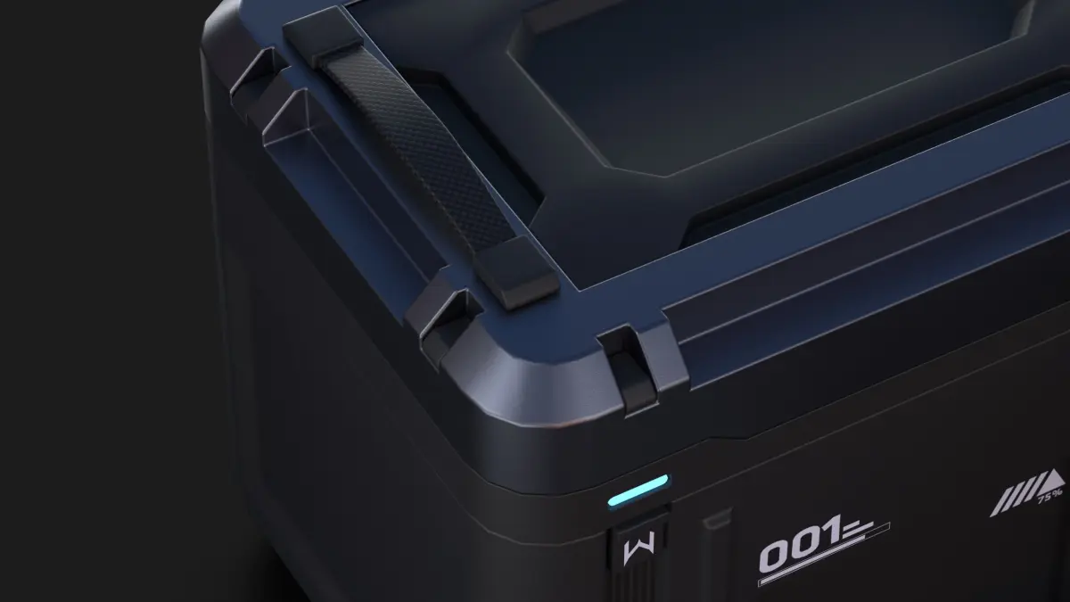 A metal mechanical box,Game console props,Detailed details, text maps, lighting,future, technology, lockbox, machinery, treasure chest