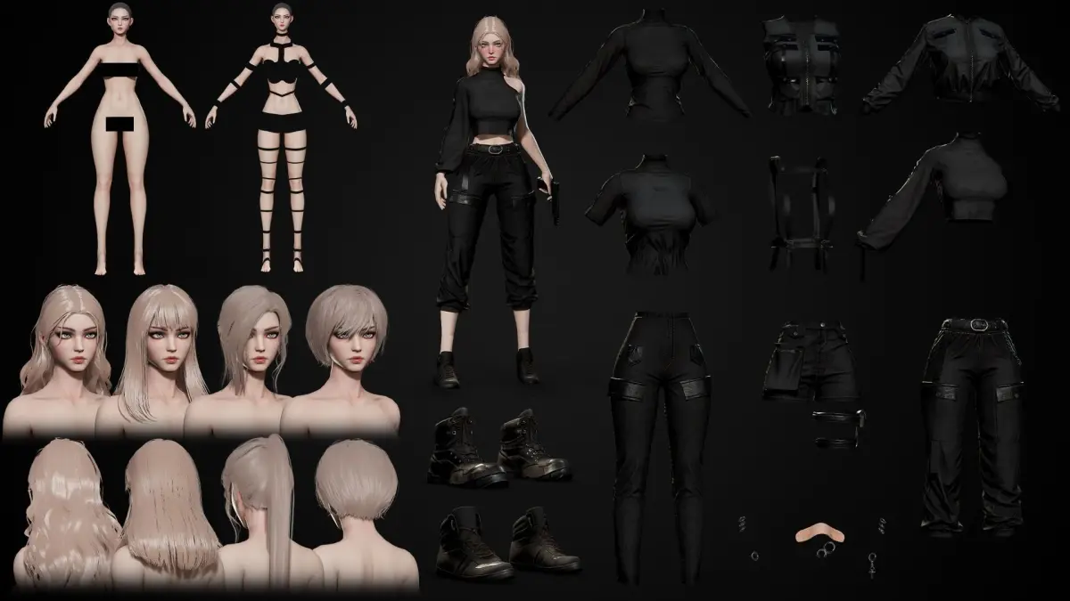 15 Texture sets - Body, Head, Teeth, Hair, Eyes, Lashes, Top 01-04, Pants 01-03, Shoes 01-02