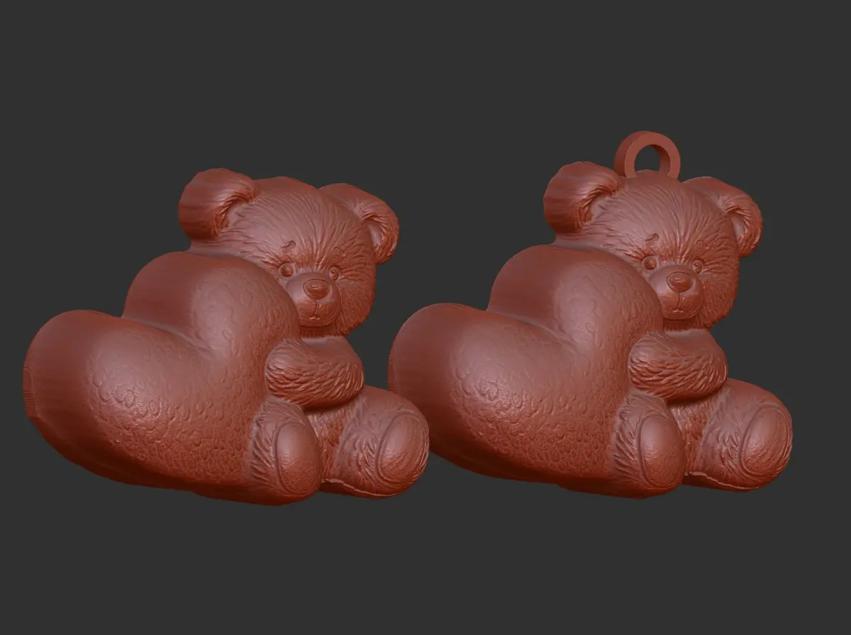 Teddy Bear: The teddy bear can have an adorable, stylized appearance, with oversized, rounded features. Its face should have big, expressive eyes, a soft, gentle smile, and a small nose to emphasize its cuddliness. The body should be plump and soft-looking, with gentle, smooth curves to enhance the bear's charm. Its arms and legs should be short and stubby to further emphasize its cuteness. For added detail, you can incorporate a subtle fur texture, but keep it light enough to maintain the smoothness required for bas-relief.Big Heart: The teddy bear should be holding, hugging, or standing beside a large, stylized heart. The heart should be oversized to draw attention and symbolize love and warmth. You can have the heart in the center of the bear's chest or cradled in its hands, making the design feel both sweet and endearing. The heart should be smooth and gently raised from the background to give it a soft, three-dimensional feel.Base Relief Design: For the bas-relief style, the teddy bear and heart should gently rise from the background, creating subtle depth. The relief should have soft, rounded transitions, avoiding sharp edges or fine details that could be difficult to reproduce in both CNC and 3D printing. The heart can have a slight texture or subtle shading to make it stand out against the smooth texture of the bear. The background could be kept simple or feature minimal elements like soft, curving lines or hearts to complement the design.Features for 3D Printing and CNC Compatibility:Geometry: The model should feature clean, simplified geometry that highlights the teddy bear’s soft, rounded shape and the heart’s smooth, symmetrical curves. The geometry should be designed to be easily printable or carveable, with no fine, intricate details that might cause issues during the manufacturing process. The teddy bear’s body, arms, and legs should be smooth, and the heart should have a simple, clear shape to stand out.Support and Orientation: The teddy bear and heart should be positioned in a way that minimizes overhangs and reduces the need for excessive support structures. Ideally, the design should have a balanced layout where the teddy bear is standing or holding the heart in a way that makes printing or carving straightforward.Material Considerations: For 3D printing, materials like PLA, resin, or PETG would work well. For CNC carving, wood or soft acrylic could be ideal, allowing for easy carving of the rounded edges and soft transitions in the design.