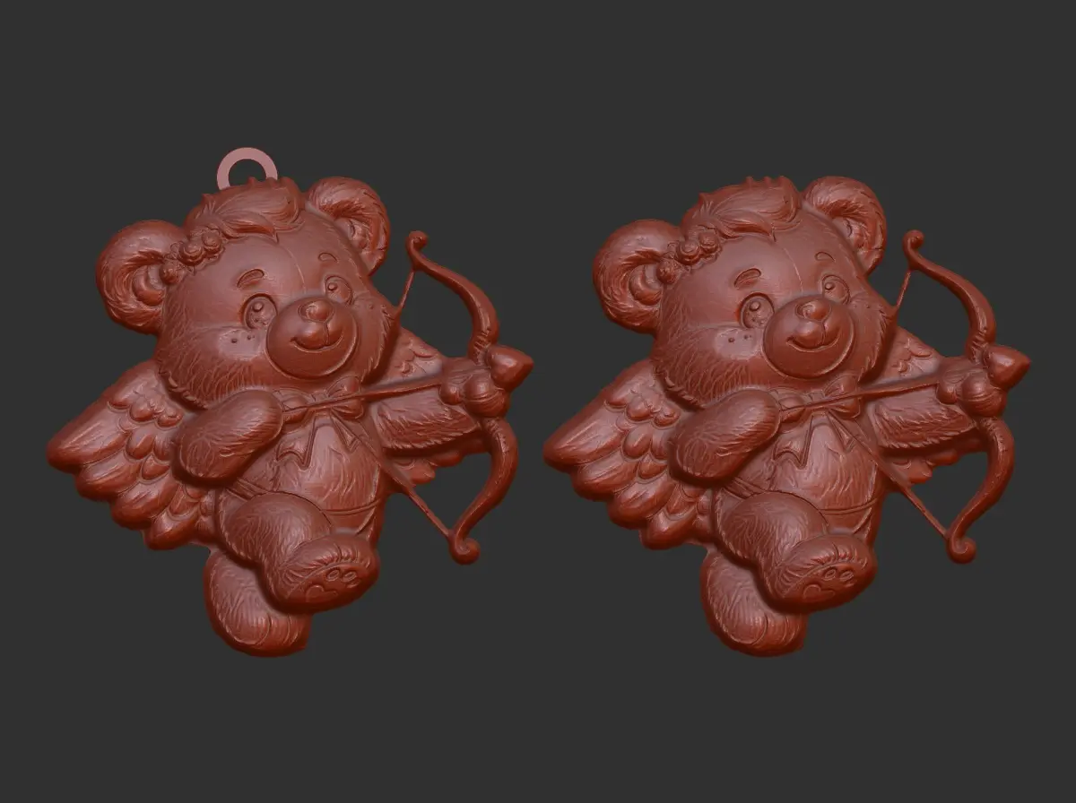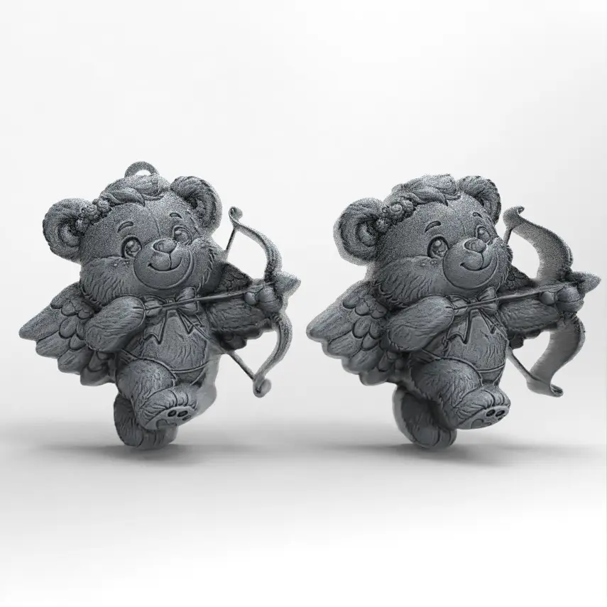 Teddy Bear: The teddy bear should have a soft, friendly appearance with rounded, plush features. Its face should be sweet and endearing, with big, expressive eyes and a gentle smile. The bear’s body could be slightly plump, with short, stubby arms and legs to enhance its cuddliness. For texture, you can add subtle fur details to give the bear a soft, plush look. The teddy bear can be sitting or standing, possibly with its arms slightly open, as if it’s offering or embracing love.Love Wings: The wings should be large, soft, and angelic, adding a magical or ethereal quality to the design. The wings could have a heart-shaped motif incorporated into them or be slightly stylized with flowing feathers, giving them a light, airy appearance. The wings should extend from the teddy bear’s back or shoulders, adding a sense of grace and delicacy to the design.Base Relief Design: In bas-relief style, the teddy bear and wings should be gently raised from the background. The relief should emphasize soft, rounded forms and smooth transitions, avoiding sharp or intricate details that could be challenging to reproduce. The wings should have flowing, curved lines to suggest movement and lightness. The background could feature simple elements like hearts, clouds, or soft curves to complement the theme of love and warmth.Features for 3D Printing and CNC Compatibility:Geometry: The model should have clean, simple geometry with well-defined but smooth details. The teddy bear’s body should be sculpted to reflect plush, rounded shapes, while the wings should have flowing lines and soft transitions. The model should be designed to minimize overly intricate details that could complicate the printing or carving process. The heart or love motifs can be subtly integrated into the wings or background to enhance the theme without overpowering the design.Support and Orientation: The teddy bear and wings should be positioned to minimize overhangs, making it easier to print or carve without requiring excessive support structures. The design should ensure that the bear’s rounded forms and the wings’ delicate features are positioned in a way that’s efficient for both 3D printing and CNC carving.Material Considerations: For 3D printing, materials like PLA, resin, or PETG are ideal for achieving smooth, clean results. For CNC carving, materials like wood, acrylic, or soft metals would be suitable, allowing for easy carving of the teddy bear’s body and the delicate details of the wings.