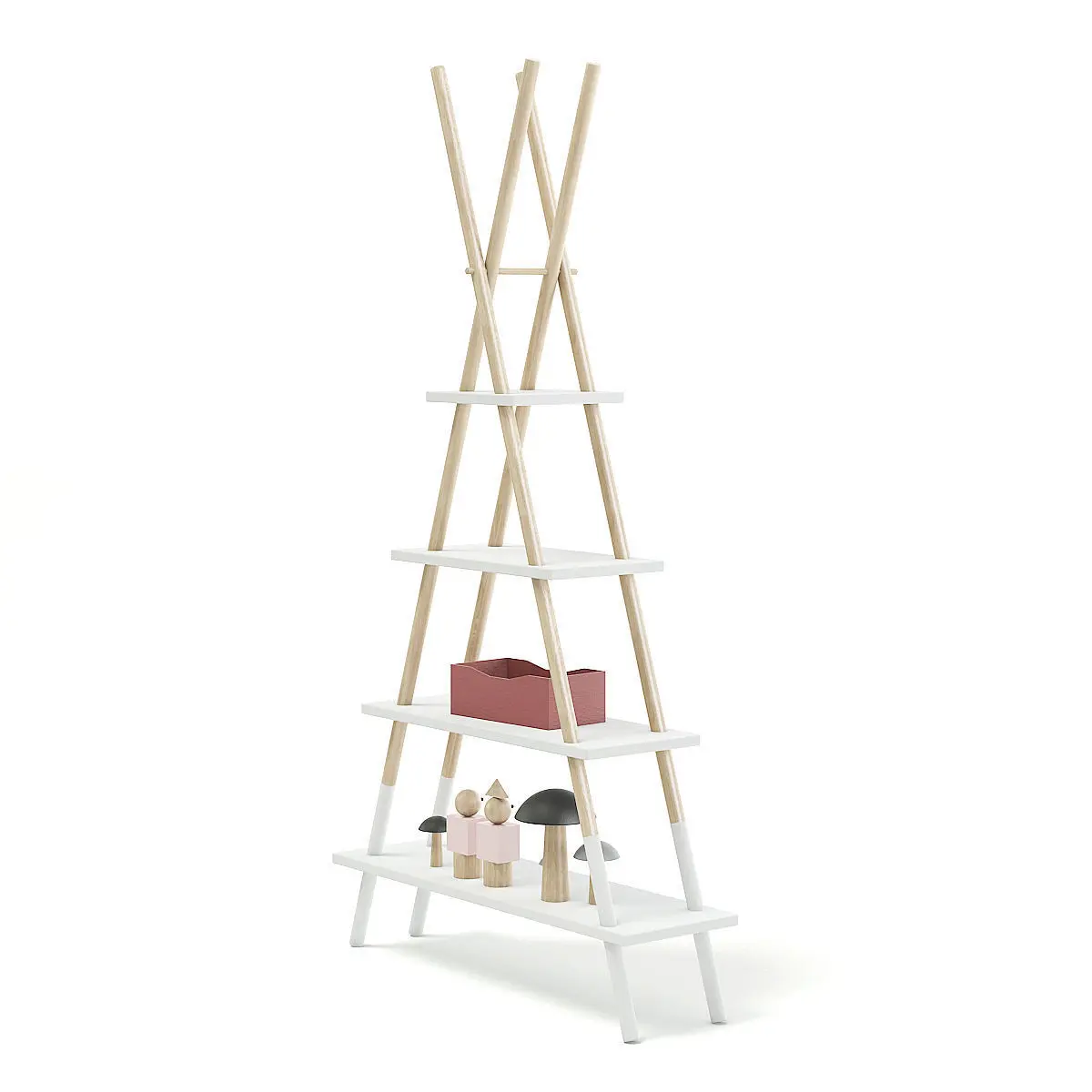 3D model of teepee shape shelf with a red rectangular basket and some wooden decorations. Compatible with 3ds max 2010 or higher, Cinema 4D R15 and many more.
